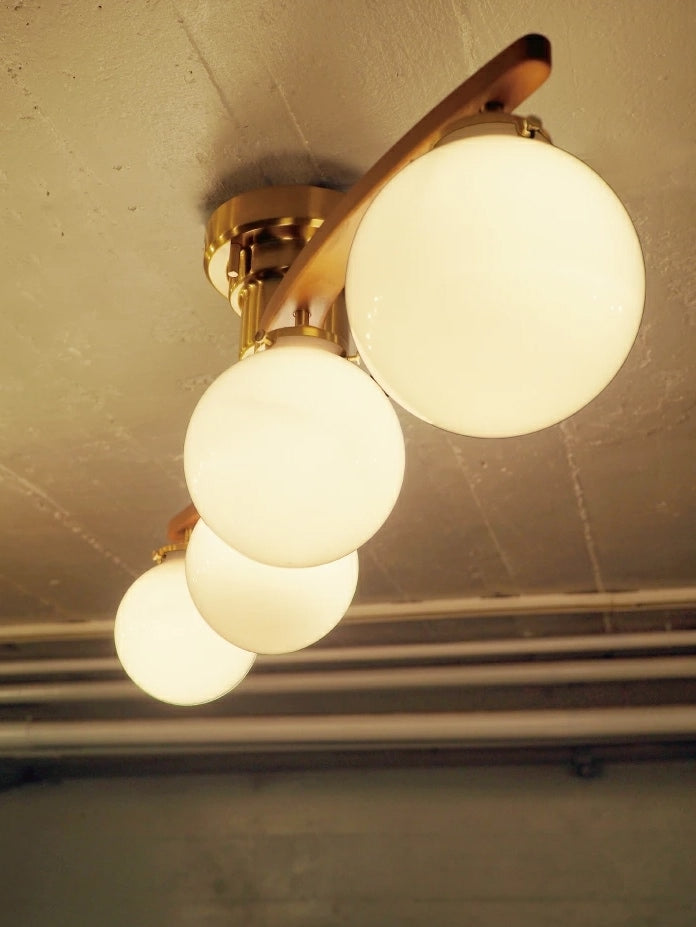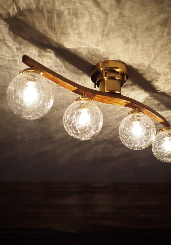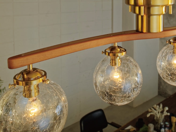 緩やかなカーブを描きながら伸びるウッドアームに、ボリュームのあるガラスシェードを合わせたシーリングライト。 ゴージャスで品格のある空間を演出します。