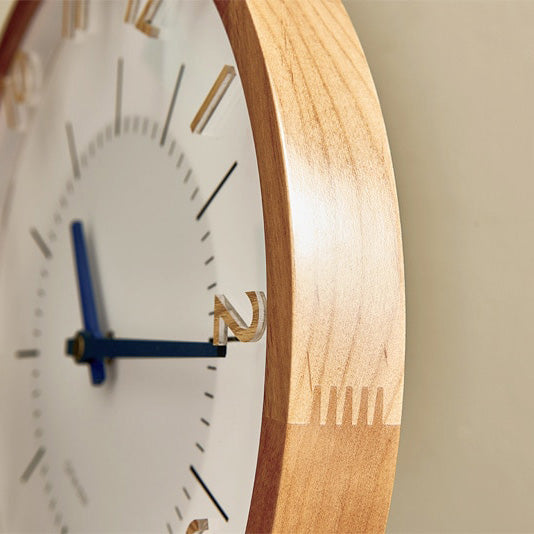 木製の針がアクセントとなったナチュラルモダンな電波時計。 ガラスの上に数字パーツを置くことで立体感が生まれ、奥行きを感じられる仕上がりになりました。