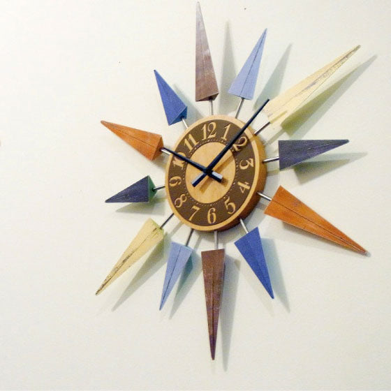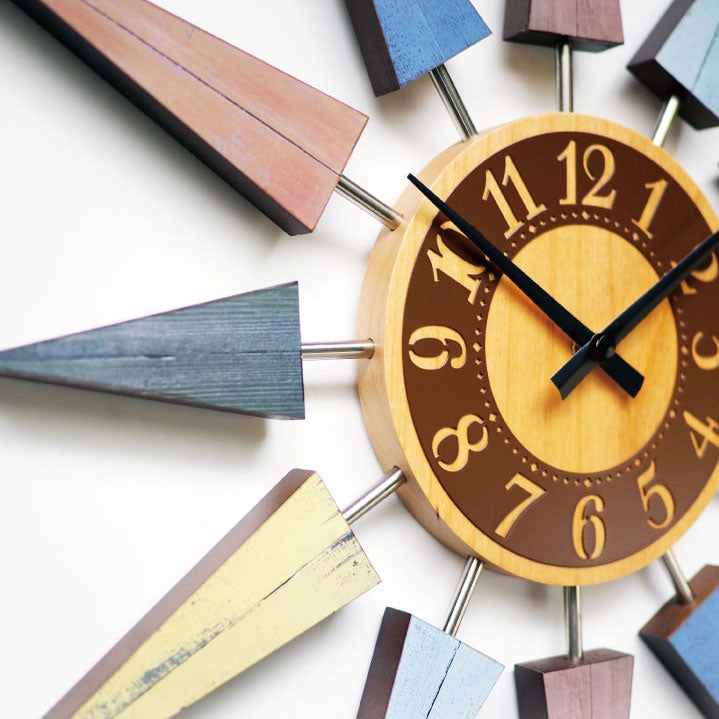- 矢印のようなパーツを放射状に広げるシンボリックなウォールクロック。 シャビーなカラーリングでレトロさをプラスした、アットホームなデザインです。