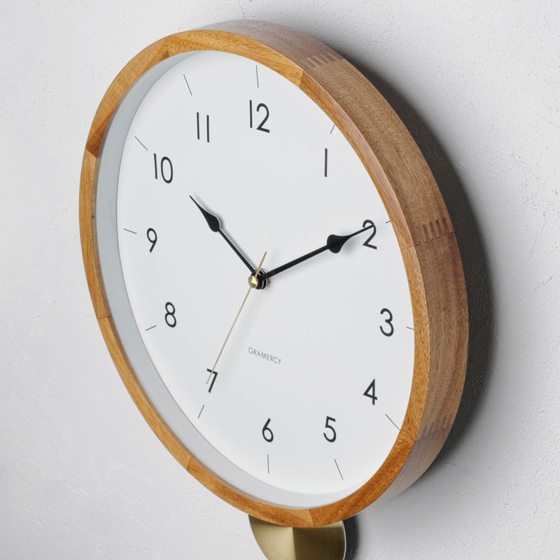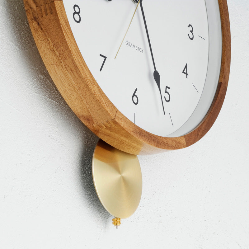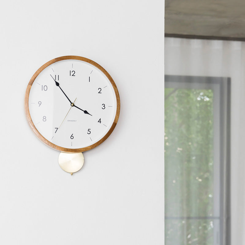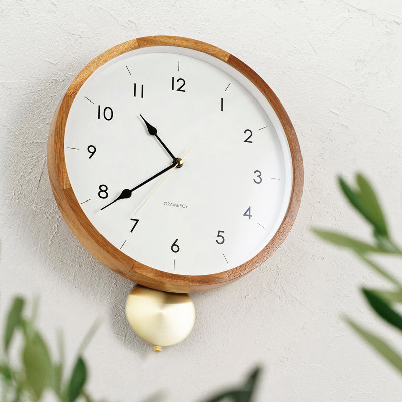 ゴールドの振り子が穏やかな時を刻む、クラシカルなウォールクロック。 シンプルな文字盤をあたたかみのあるウッドフレームが囲む、品格を感じられるルックスです。