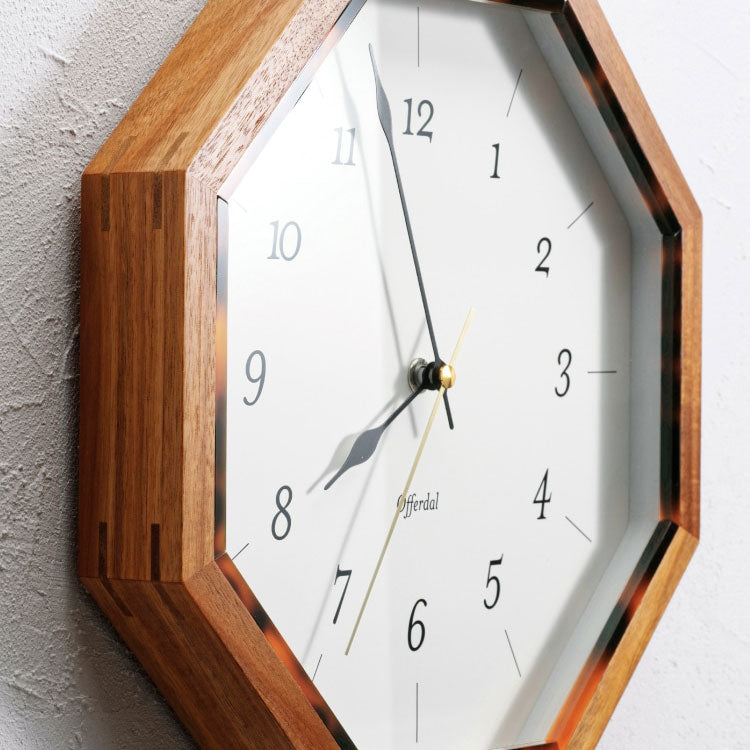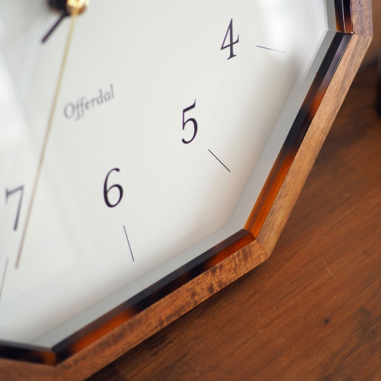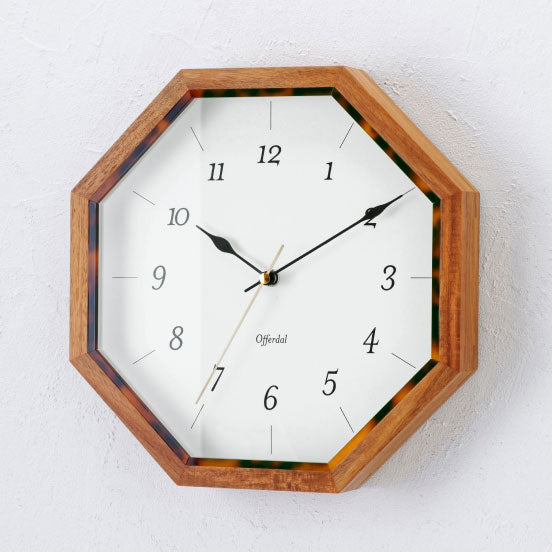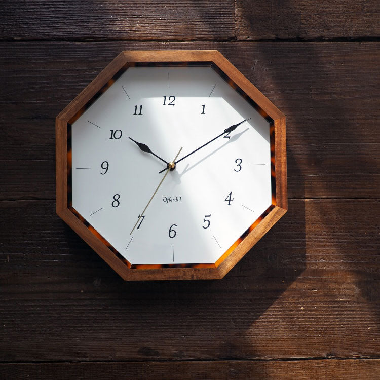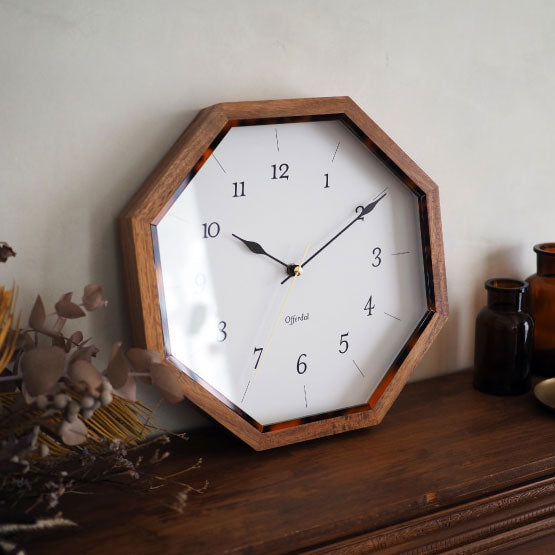 - 八角形のウッドフレームの内側に、さりげなくべっ甲調のアクセントを添えたウォールクロック。ホワイトの文字盤にレトロなフォントを採用し、長くお使いいただける落ち着きのあるデザインに仕上げました。