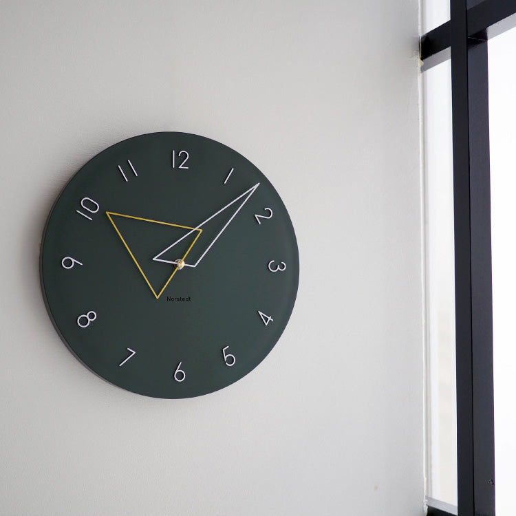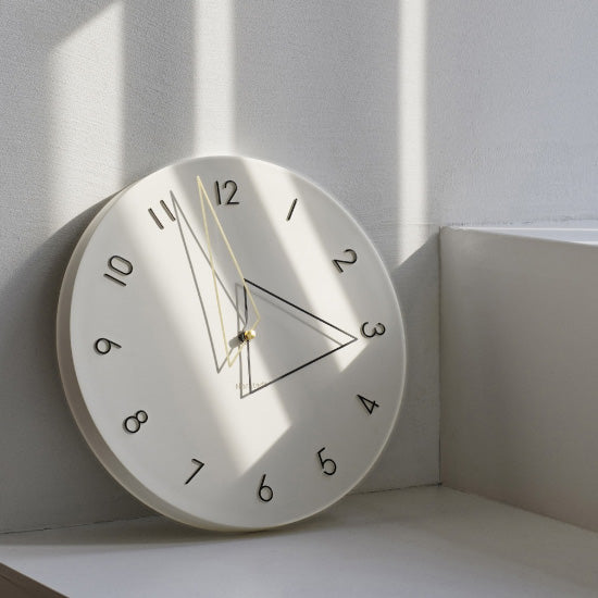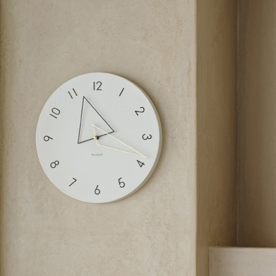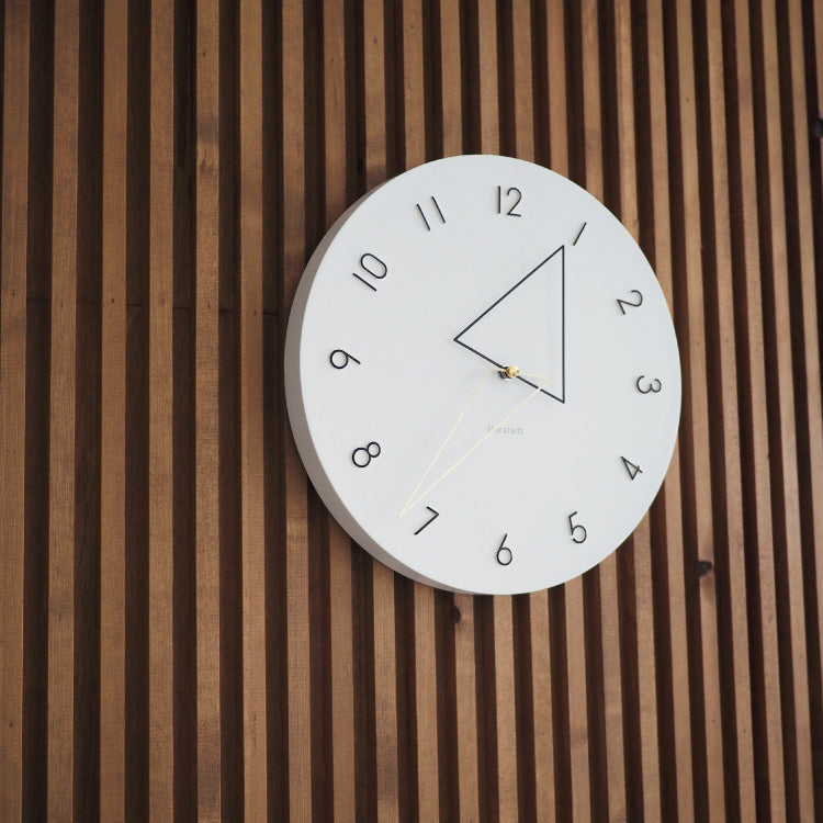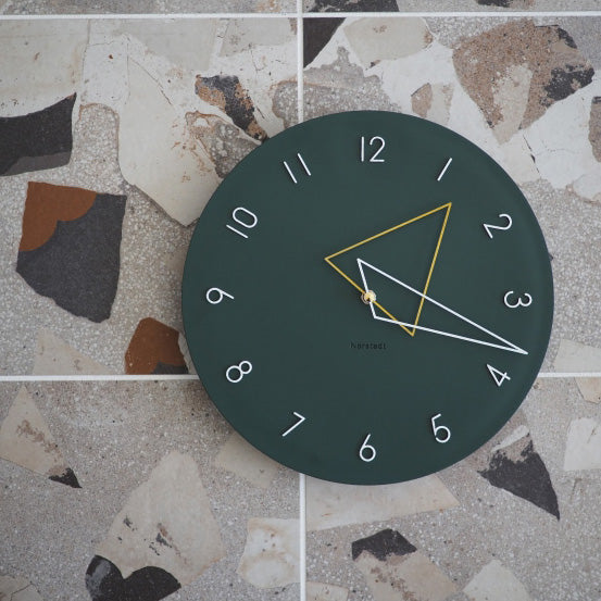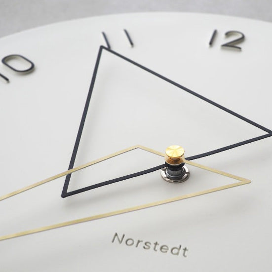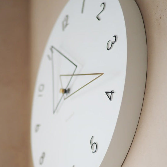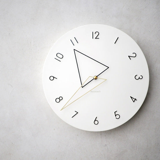 - ジオメトリックな針が目を惹く遊び心にあふれたウォールクロック。 大小の三角形で表した長針と短針の重なりが、時間が進むにつれて変化します。