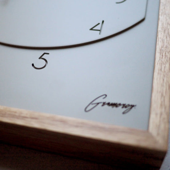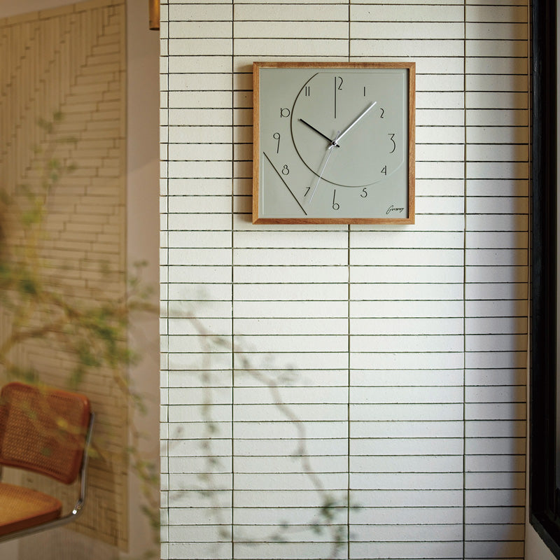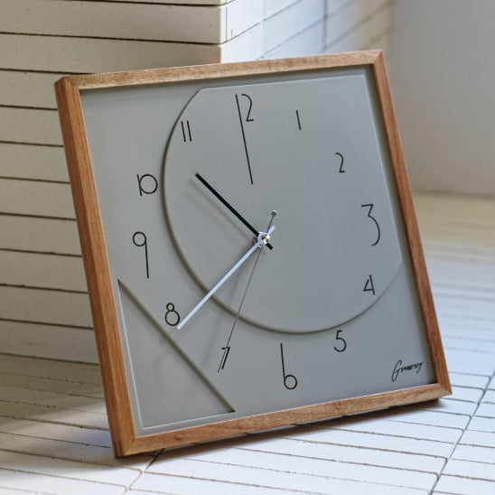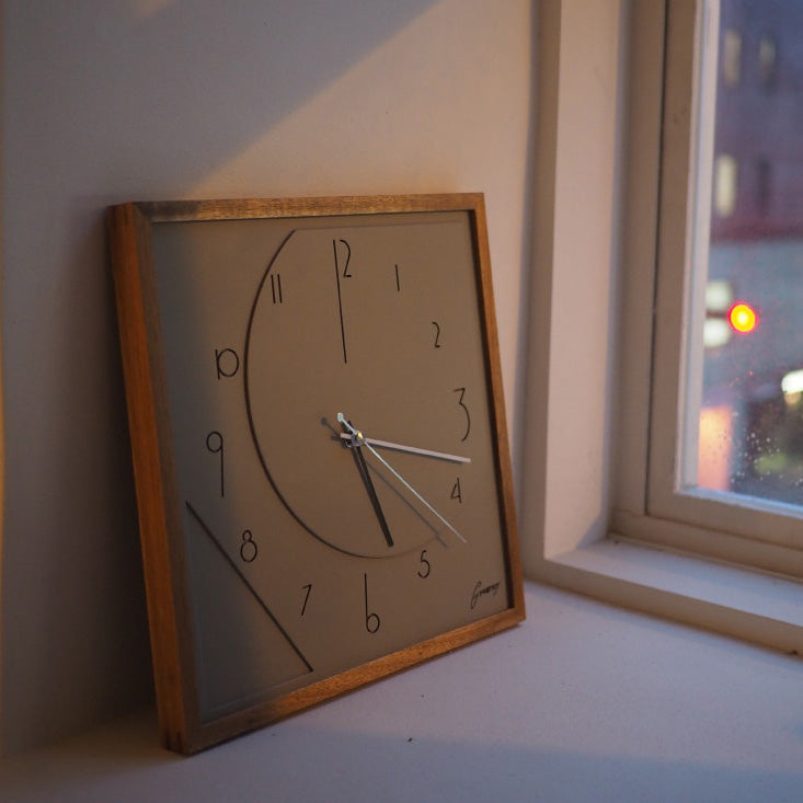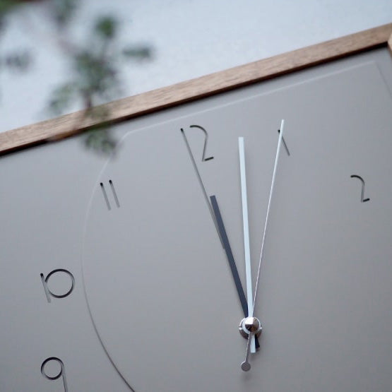 - アートを飾るように時計を楽しめたら。そんな発想を元にデザイン性と実用性を共存させ、ゆったりとした時間に溶け込むようなインテリアピースに仕上げました。〇や△、数字を段差だけで表現したスカルプチュアルなグレージュの文字盤と、それを囲むウッドフレームが高級感を感じさせます。