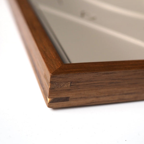 額縁のようなウッドフレームはあえて奥行きを削り、壁馴染みの良さを高めました。