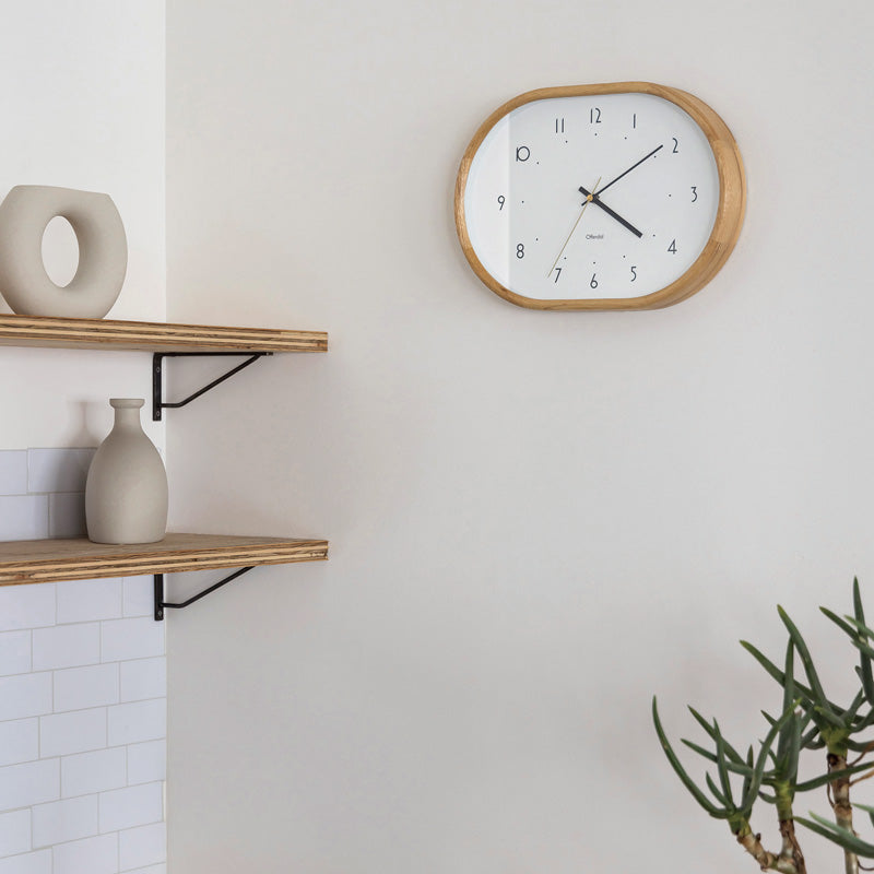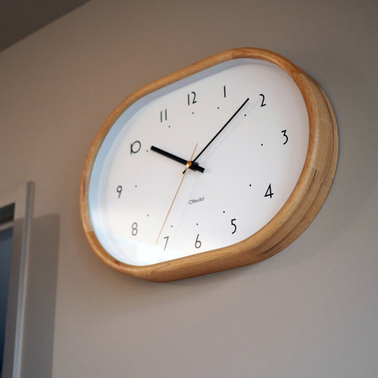 - スタンダードなエレメントも、親しみやすいオーバルシェイプやレトロポップな数字と組み合わせることで、こだわりを感じさせるルックスに。角に丸みを持たせたウッドフレームが家具のような装いを見せます。明るく、清潔感のあるデザインにはディテールへのこだわりが欠かせません。