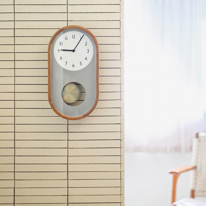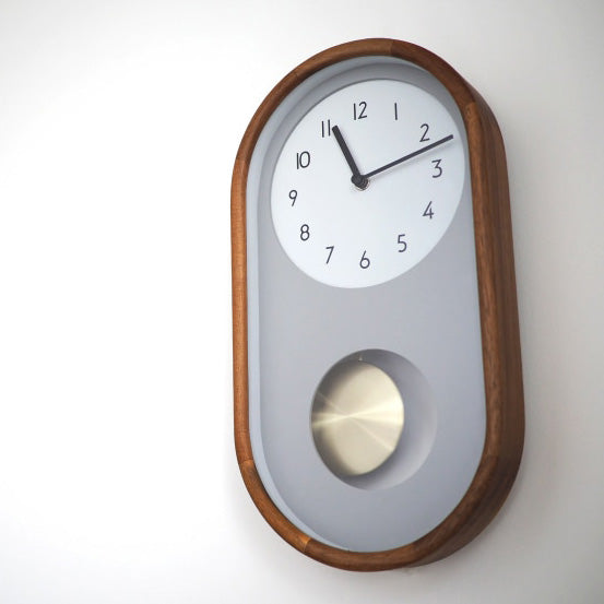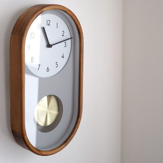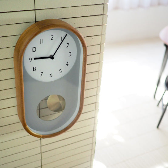 - コンセプトはクラシカルでコンパクト。一般的には大きい印象の振り子時計を飾りやすい縦長フォルムに落とし込みました。ていねいに角を落としたウッドフレームとシンプルな文字盤デザインの組み合わせが上品な仕上がりです。レイヤードさせたグレーの文字盤の後ろで揺れる、少し大振りなゴールドの振り子がレトロなエッセンスをプラスしています。