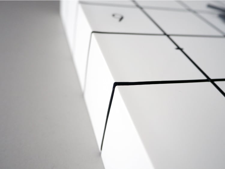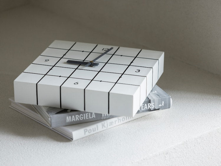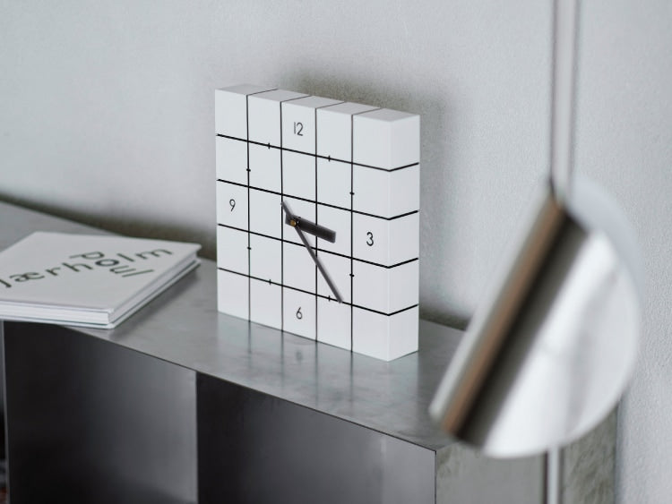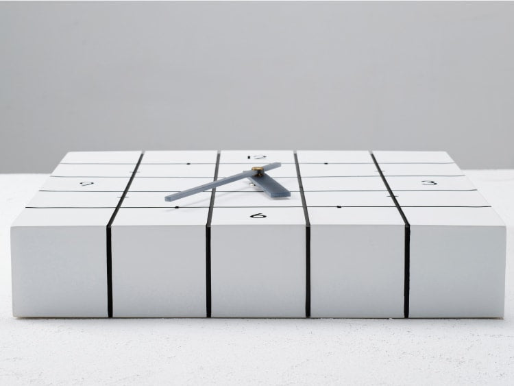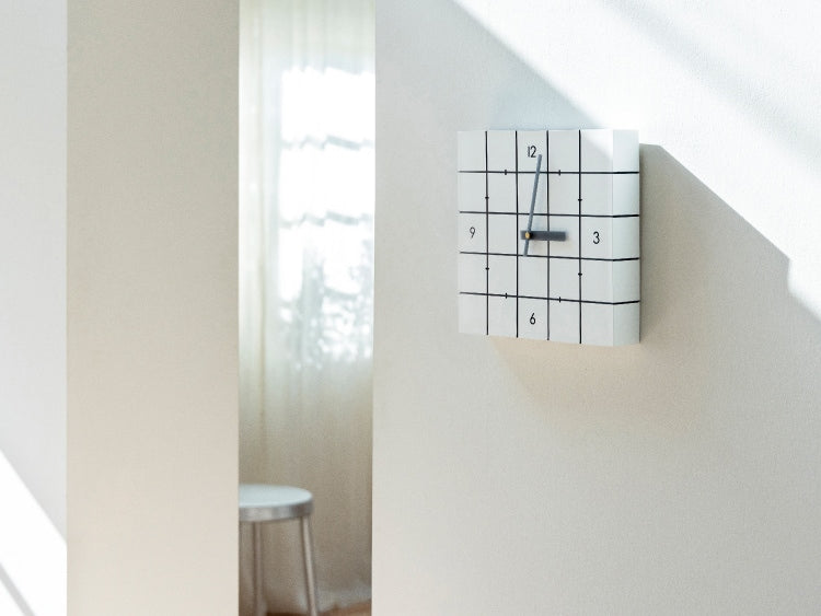 規則正しく並んだ直線が縦と横に走る方眼紙と、針の軌道が円形になるアナログ時計を掛け合わせた実験的なデザイン。