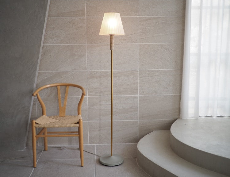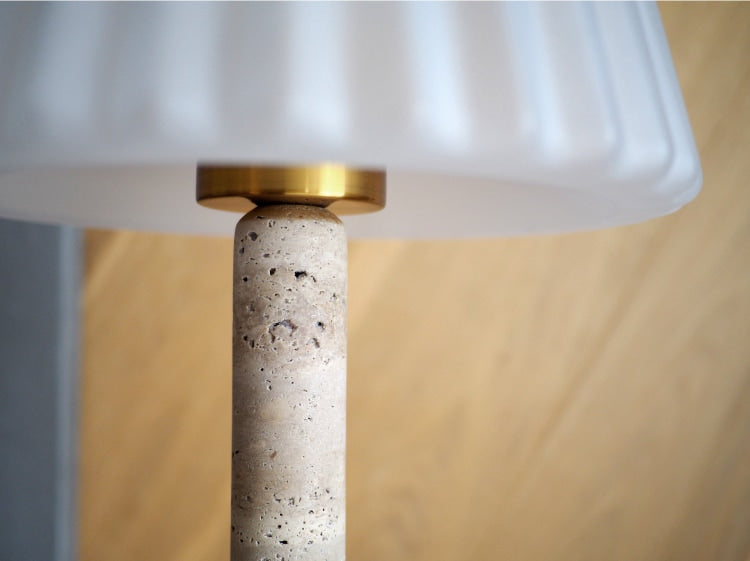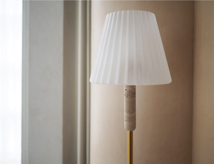ドレープをつけたフロストガラスに粗野な質感のトラバーチンを合わせたフロアライト。