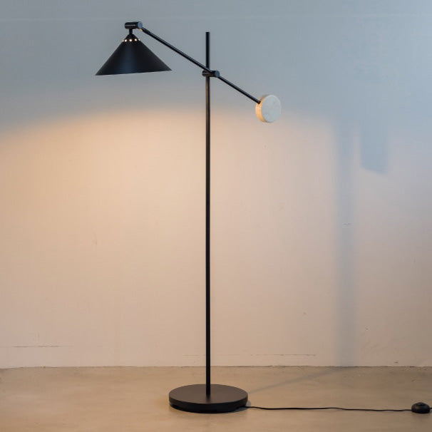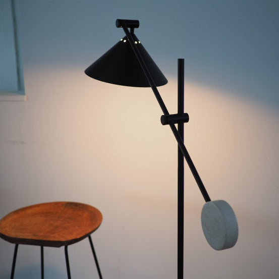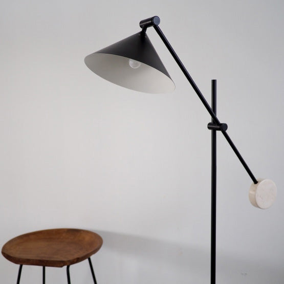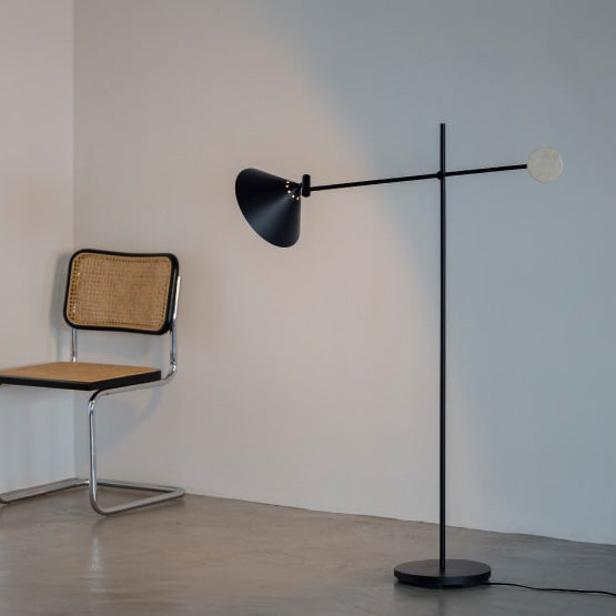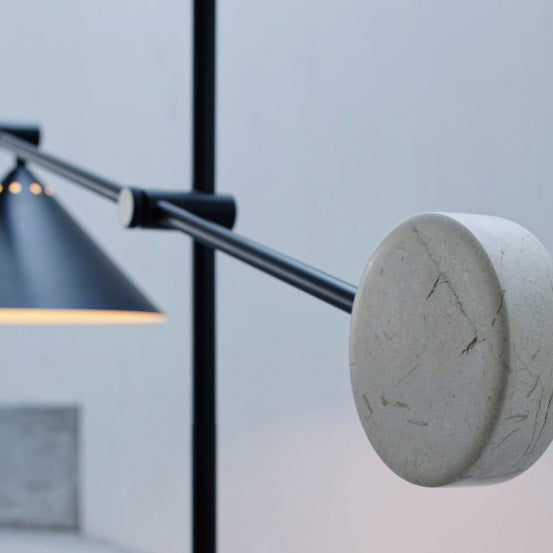 - ミニマリズムを意識しながらも、〇や△の形状を取り入れたバランス感覚に優れたフロアライト。艶のないブラックカラーに添えた大理石が、自然素材ならではの温度感をプラスしています。直立にスタイリングすれば、アッパーライトとしても機能するフレキシブルなデザイン。 アームとシェードの角度は無段階で調節が可能。