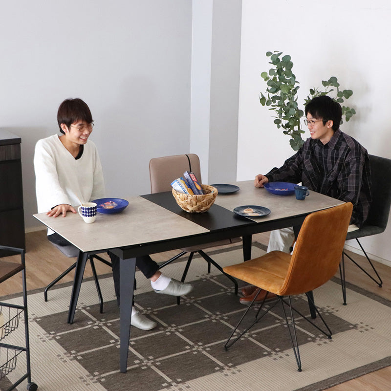セラミックテーブルシリーズより伸長式のダイニングテーブルが登場、お部屋の広さに合わせたり、人が集まった際に変更したりなど、場合によって様々な使い方のできるセラミックテーブルとなっております。