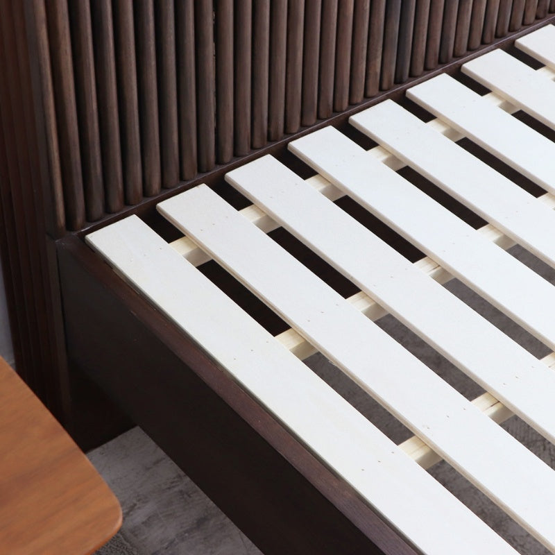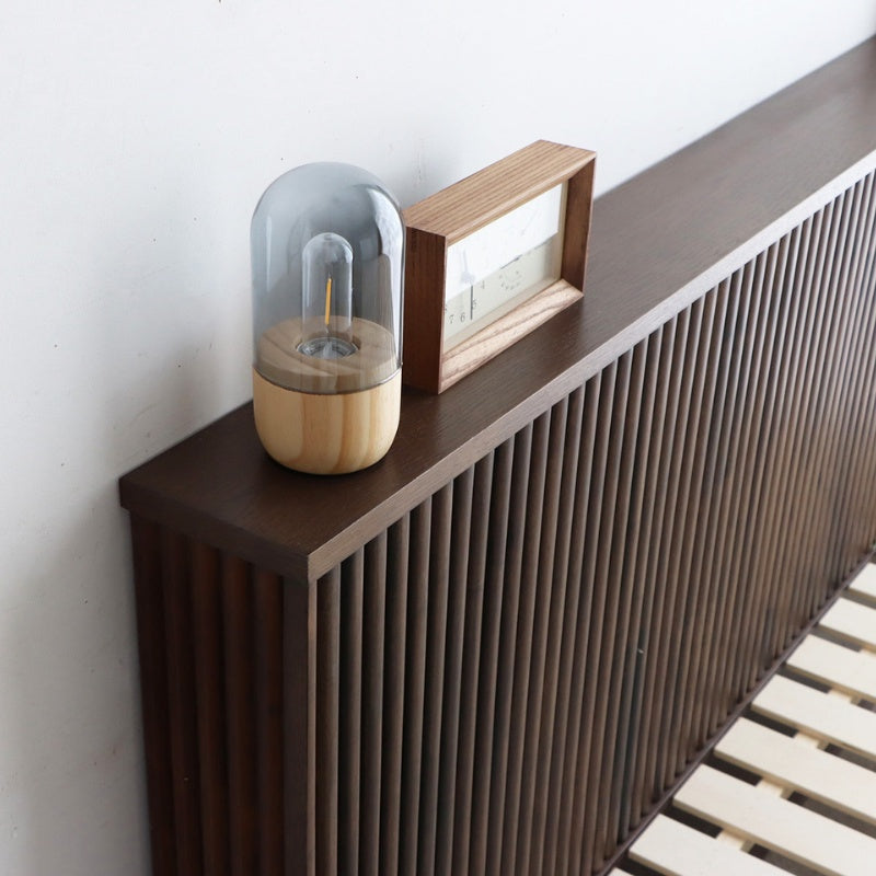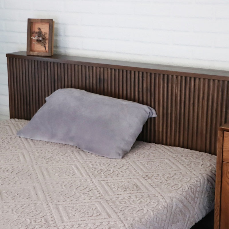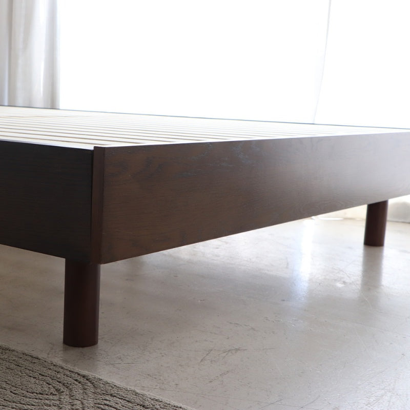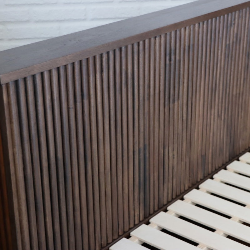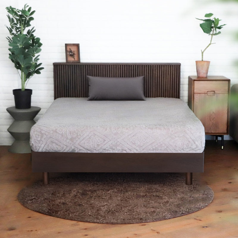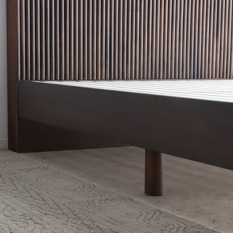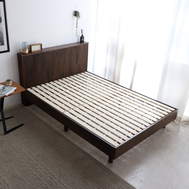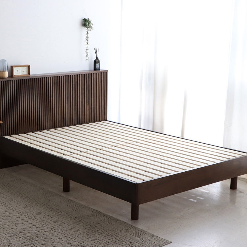 シンプルながらも完成されたデザインと、天然木の温もりが調和する上質なベッドフレーム。特徴的な縦格子のヘッドボードは、モダンで高級感あふれる空間を演出し、インテリアにも優れシックなダークブラウンが落ち着いた雰囲気をプラスします。通気性の良いすのこ仕様で、心地よい眠りをサポート。デザイン性と快適性のあるこのベッドがあなたの寝室をワンランク上の空間へ導きます。