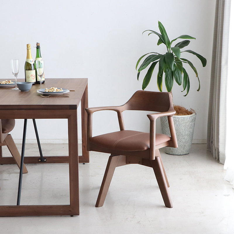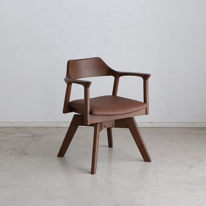 座面が回転する、木製の回転チェア。木製の良さを感じる風合いに、細部までこだわったデザインが、高級感を感じます。 座面のステッチは、PVCの張地とカラーにマッチし、アクセントをもたらしてくれます。 広めの肘置きと包み込むようなフォルムが、安心感ある座り心地です。