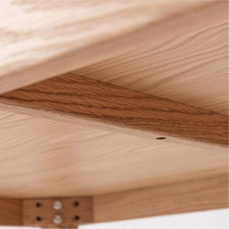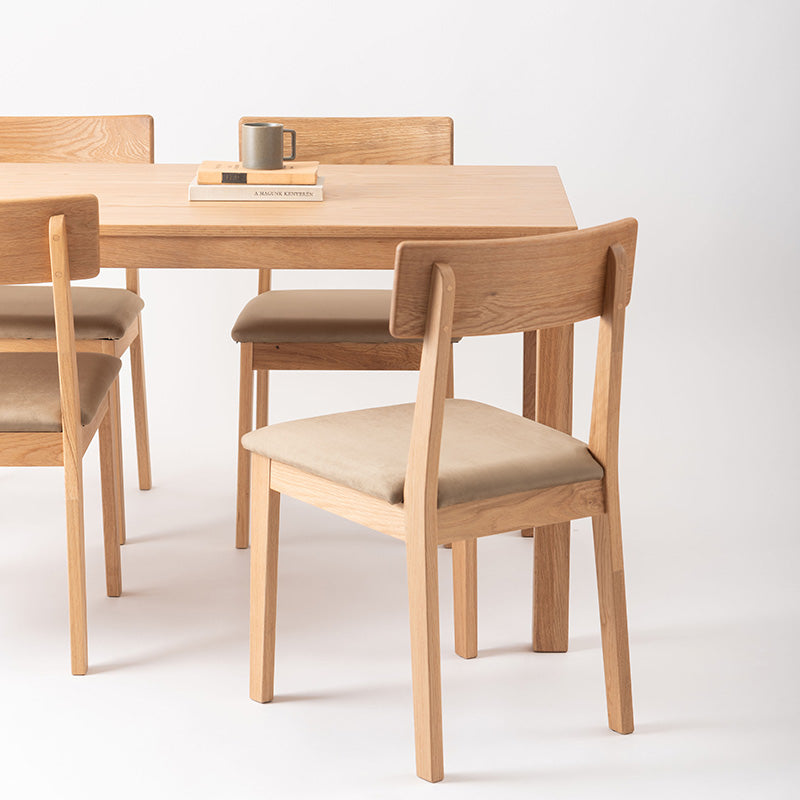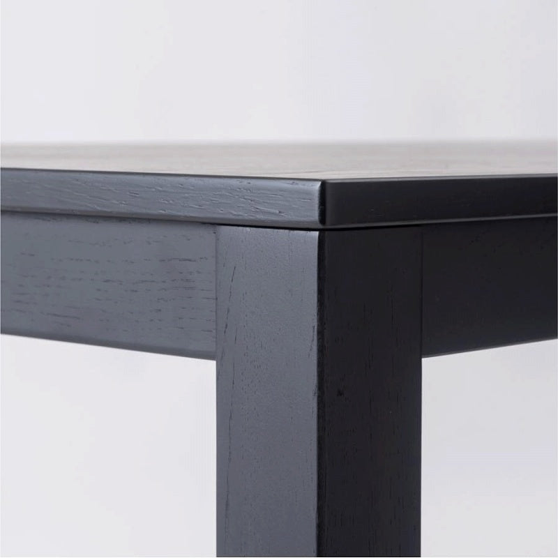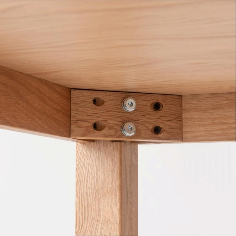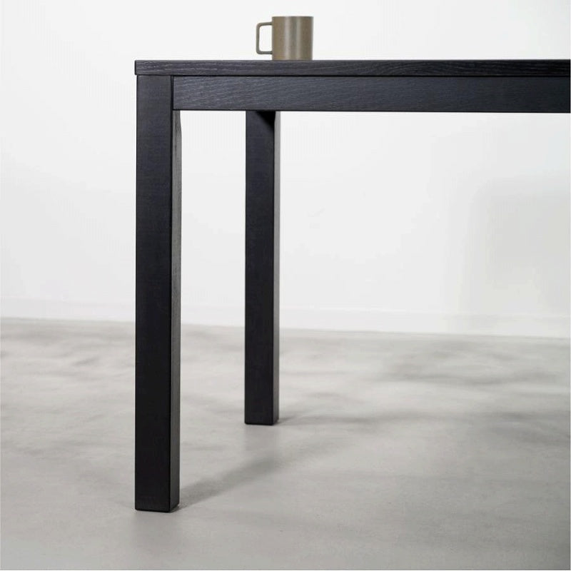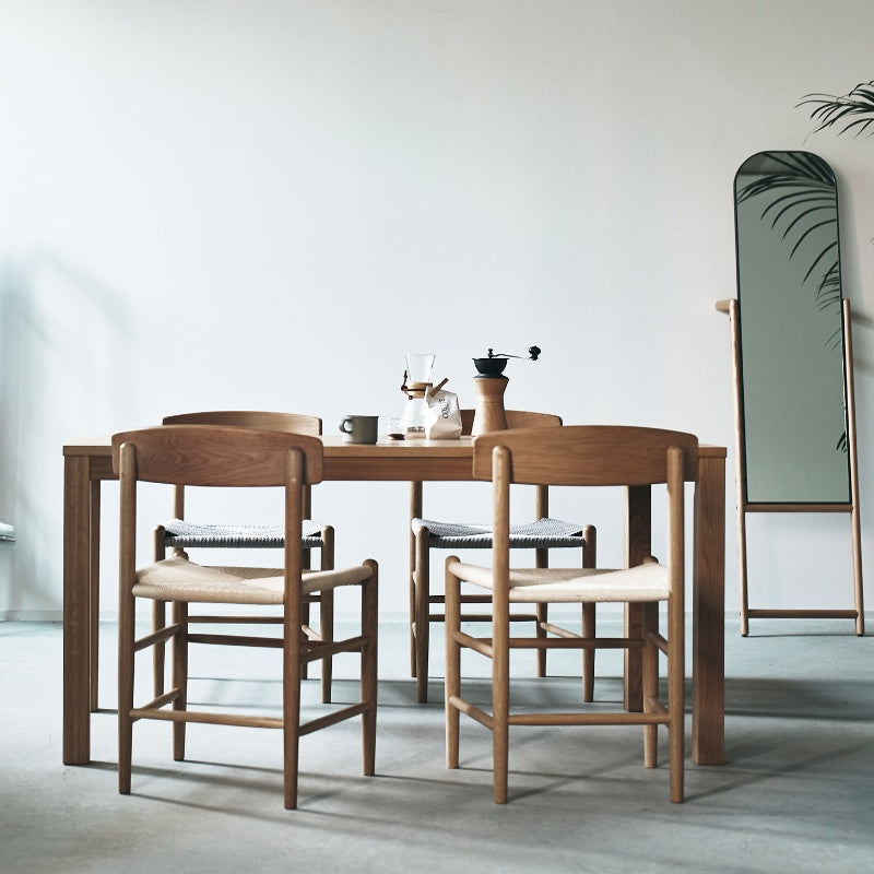 エッジの効いた直線的で普遍的なデザインのダイニングテーブルです。 オークの木目が際立つ突板貼りの天板と、重厚感のあるオーク材の脚部が魅力。