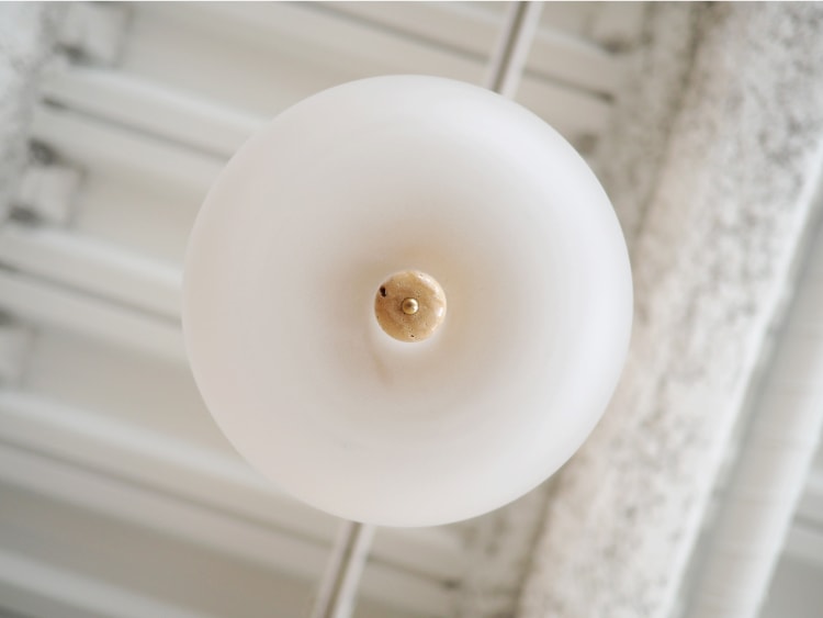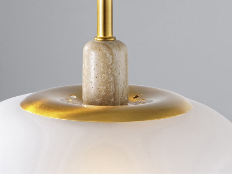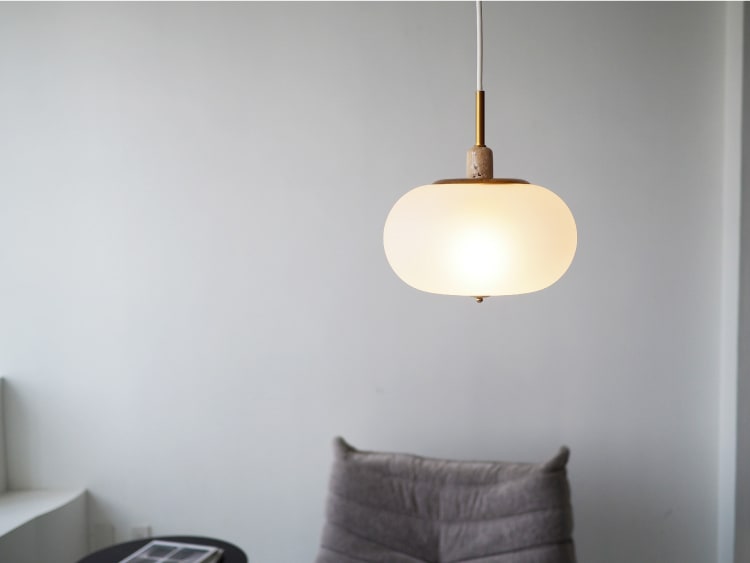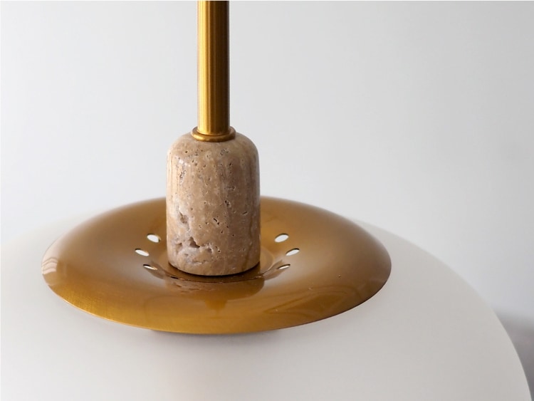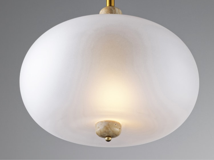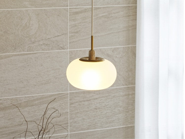 ガラスシェードの真下部分につけたなだらかなくぼみにトラバーチンを重ねています。緩やかなカーブが和やかなイメージを作り出します。