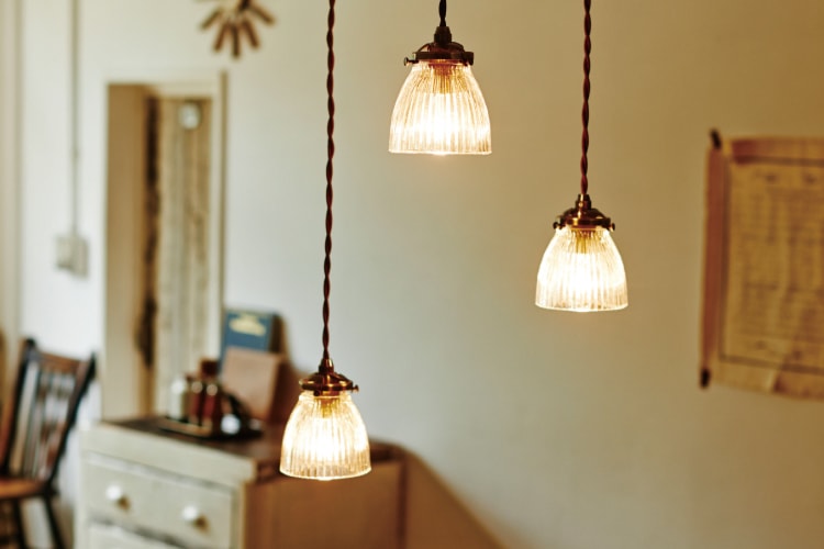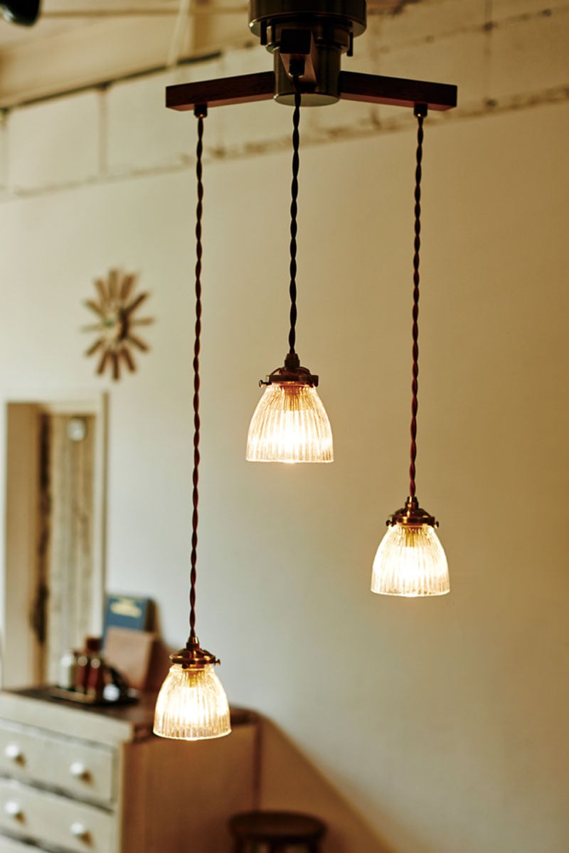 バランスを取るのが難しい複数吊りをひとつで手軽にお楽しみいただける3灯タイプです。 小さく愛らしいガラスシェードからあたたかな光が降り注ぎます。