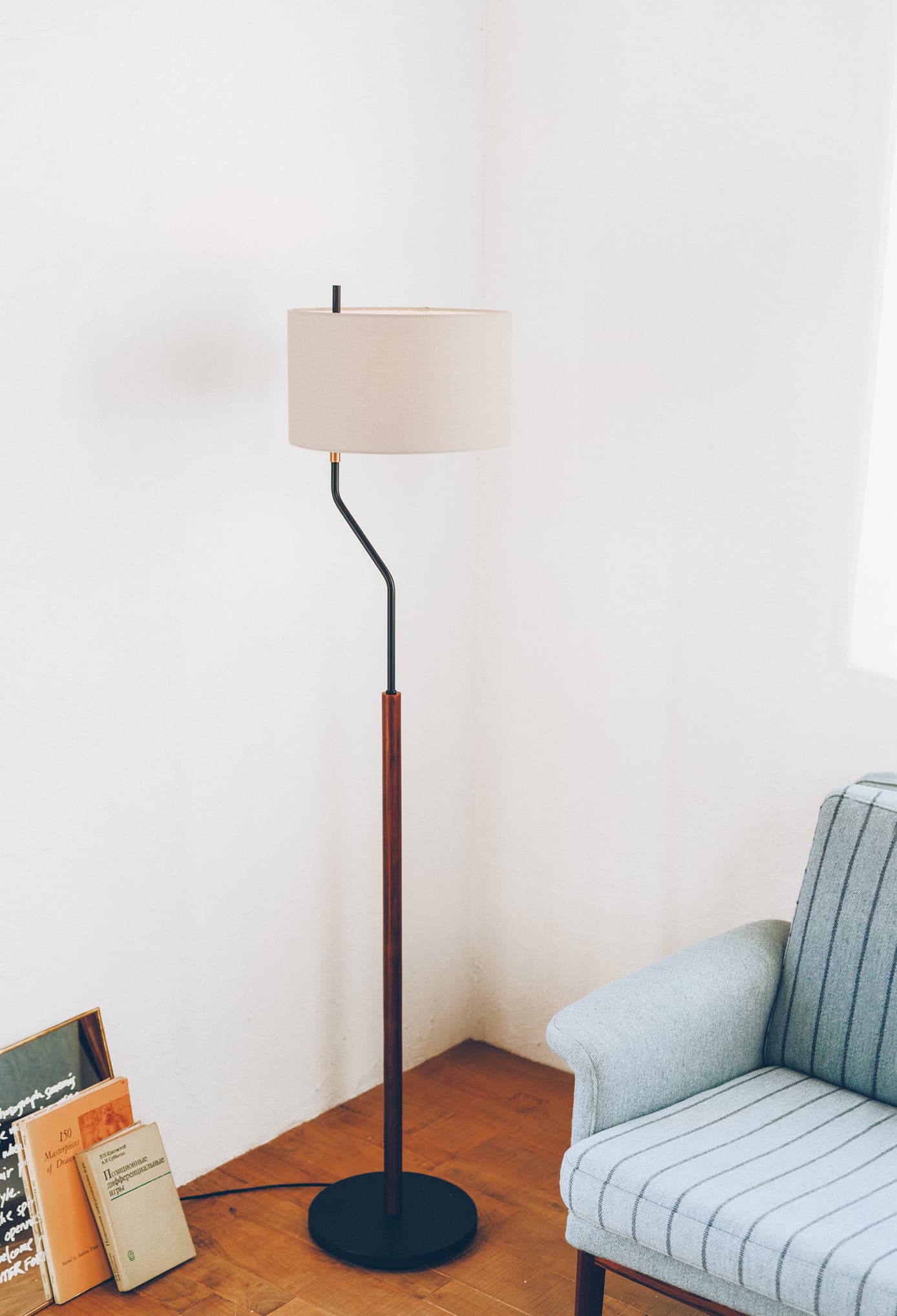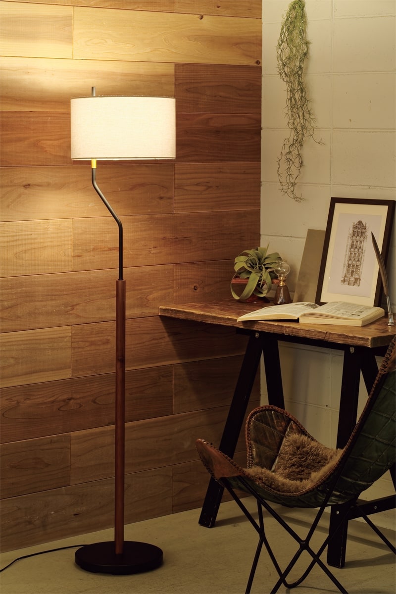 緩急のついたアームや回転するシェードなど、シンプルなデザインに個性を添えたモダンなフロアライト。 洗練されたシルエットが上質な空間を演出します。
