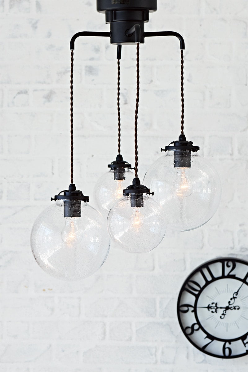 コードの長さをあえて不揃いにすることで、リズムが生まれました。 4つのガラスシェードで十分な光量を確保できるので、広めのリビングやダイニング、階段の踊り場などにおすすめです。