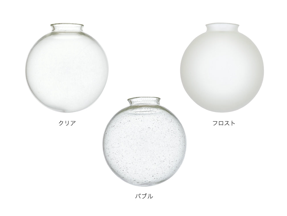 ガラスシェードはミニマルな構造が際立つ[クリア]、気泡を閉じ込めたロマンティックな[バブル]、くもりガラスで目にもやさしい[フロスト]の3種類からお選びいただけます。
