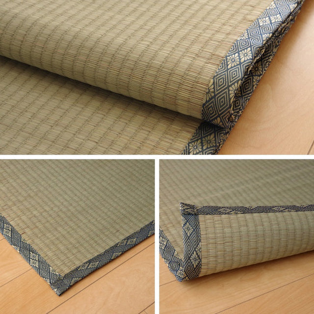 ■こちらの商品は畳表と同じ織り方の糸引織で仕上げました。双目織りと比べて、い草の打ち込み本数が多いため丈夫です。表面が滑らかなので、ホコリなどがたまりにくいのが特徴です。長くご使用されたい方や、耐久性をお求めの方には糸引織をおすすめします。