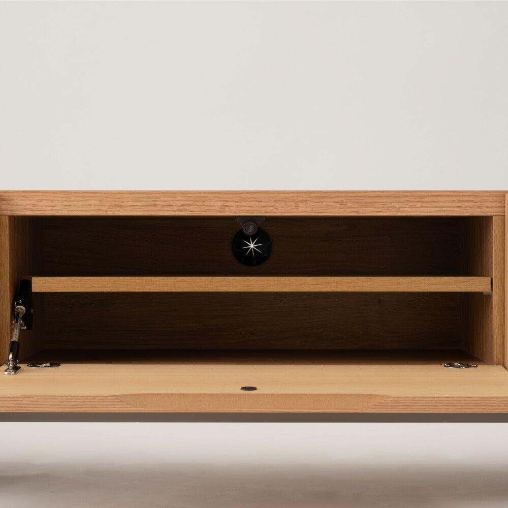 中央のフラップ扉を開けると、棚板仕切りのある収納スペースになっています。また、背板にはAV周辺機器などのコードが通せるコード穴が付いています。