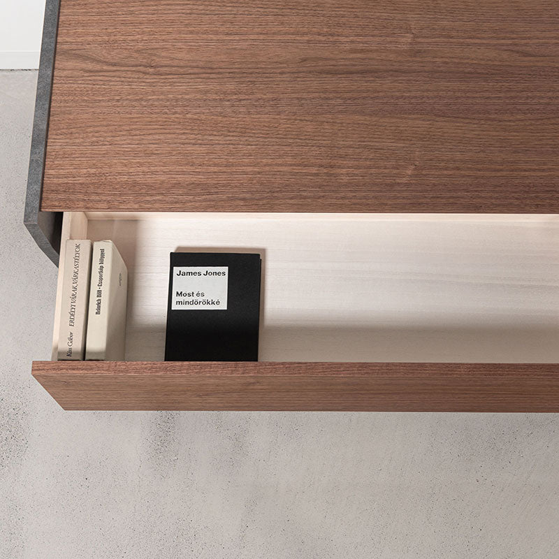 天然木の木目を活かした本体の側面に、石目調のデザインを施したローボード