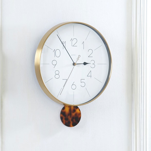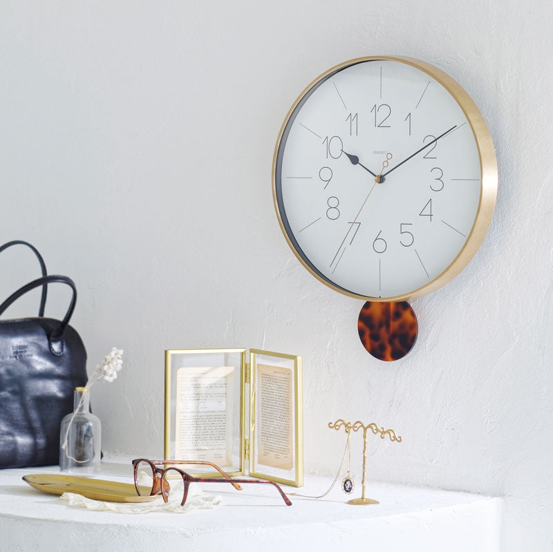 - べっ甲調の振り子が左右に揺れるフェミニンな振り子時計。 落ち着きのある輝きのゴールドフレームがクラシカルなムードを漂わせます。
