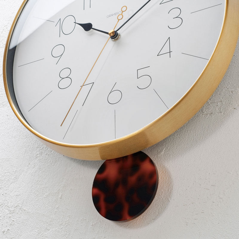 ヘアライン加工で仕上げたゴールドカラーのスリムなフレーム。 真鍮のような落ち着きのある輝きとべっ甲調の振り子のコントラストがクラシカルな印象を与えます。
