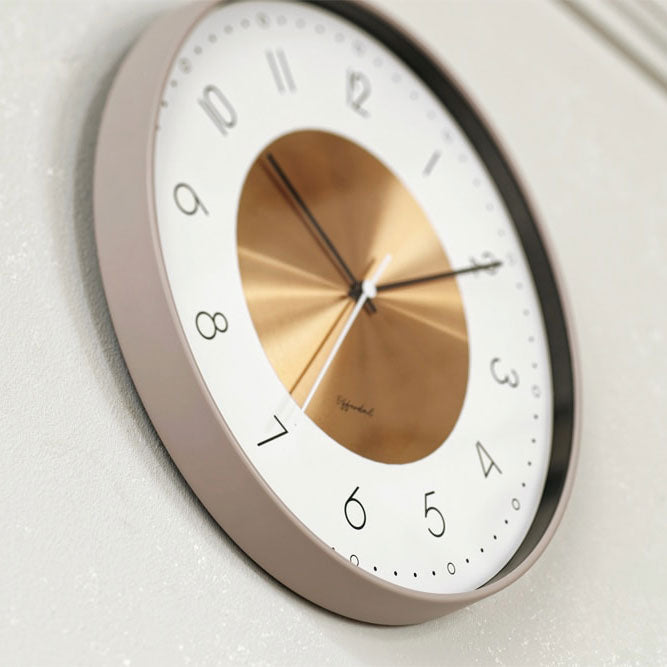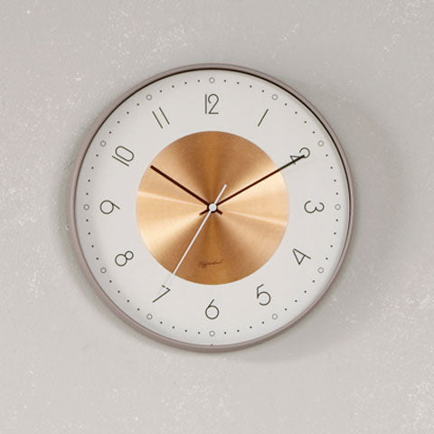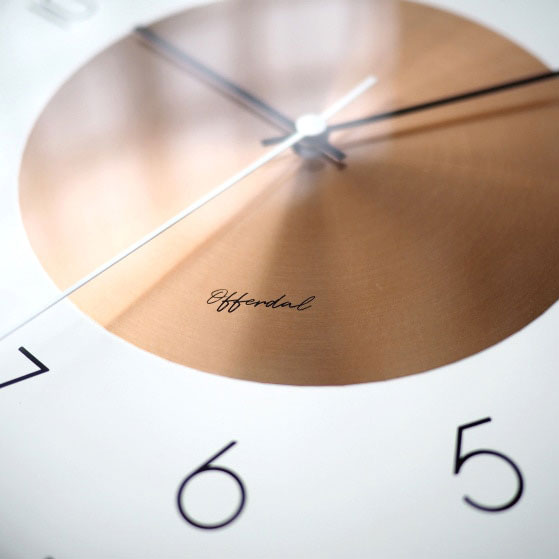 - 中央にあしらわれたコッパーのプレートがさりげなく輝くウォールクロック。 ウォームグレーのスリムなフレームと、フェミニンな文字盤デザインがマッチした上品なデザインです。
