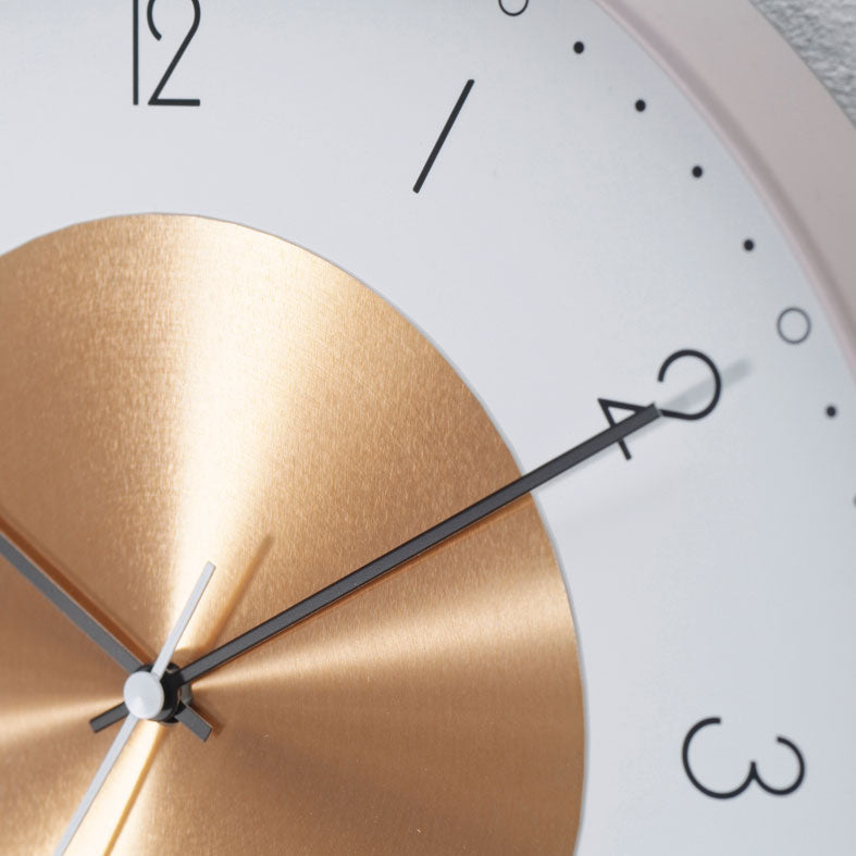 丸みのある数字やドットのインデックスがフェミニン。 ウォームグレーのフレームとコッパーカラーのコントラストが心地よい、すっきりとモダンなウォールクロックです。