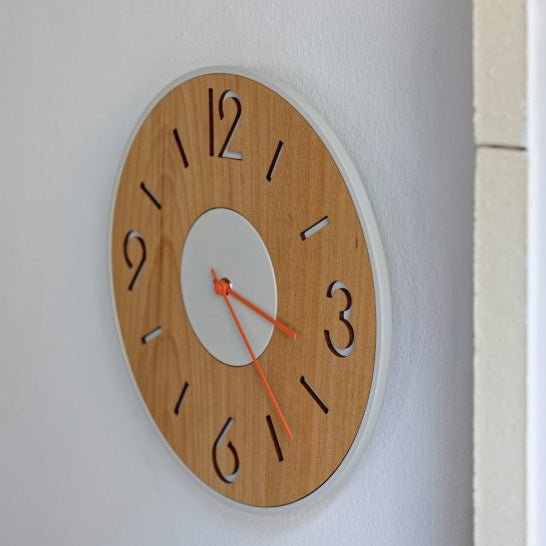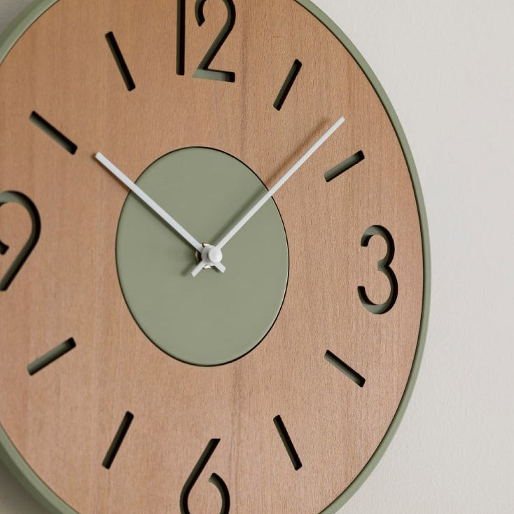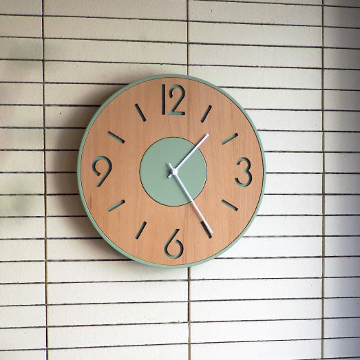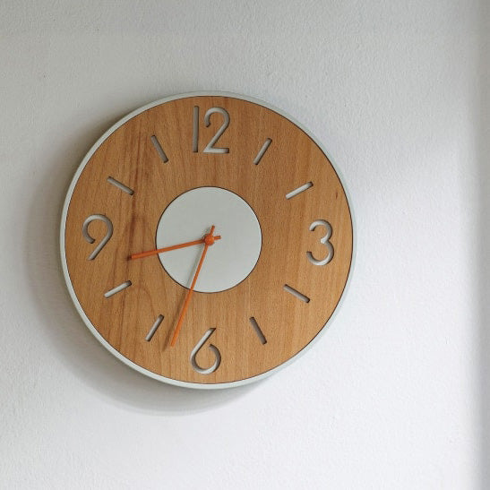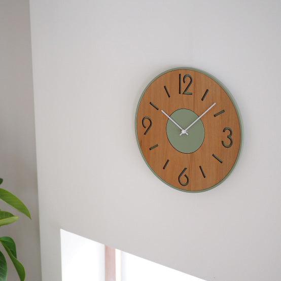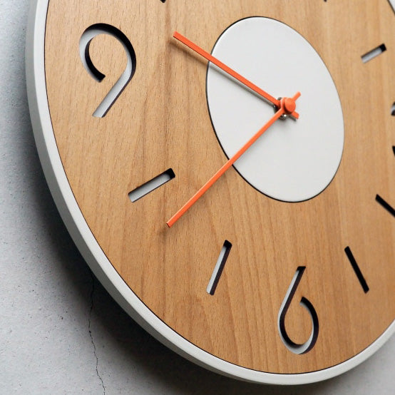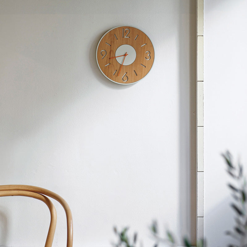 - 木目の美しい文字盤にくすみカラーが見え隠れするナチュラルなテイストのウォールクロック。 くり抜かれた数字とインデックスに落ちる影が、レイヤードスタイルの立体感をより強調させています。