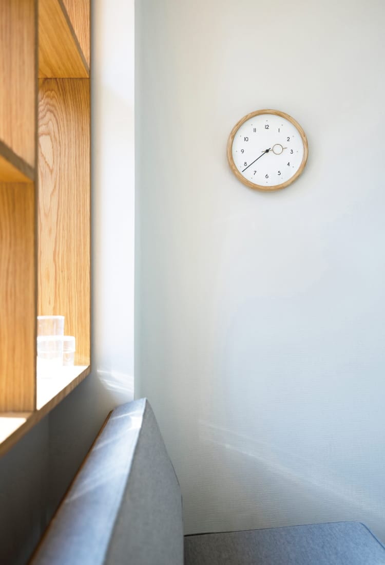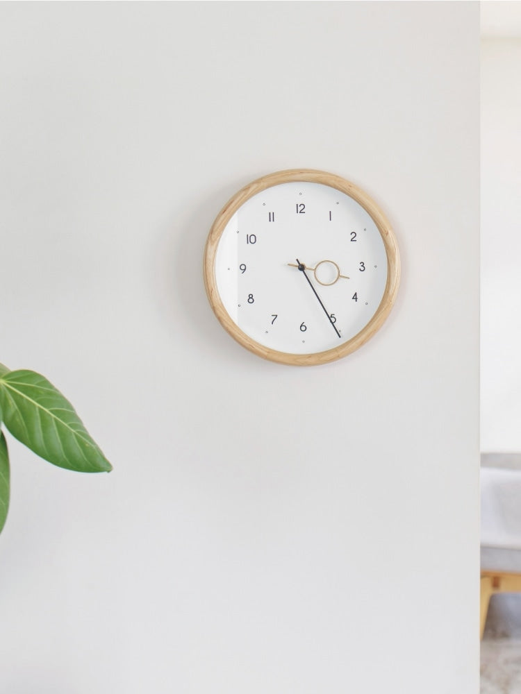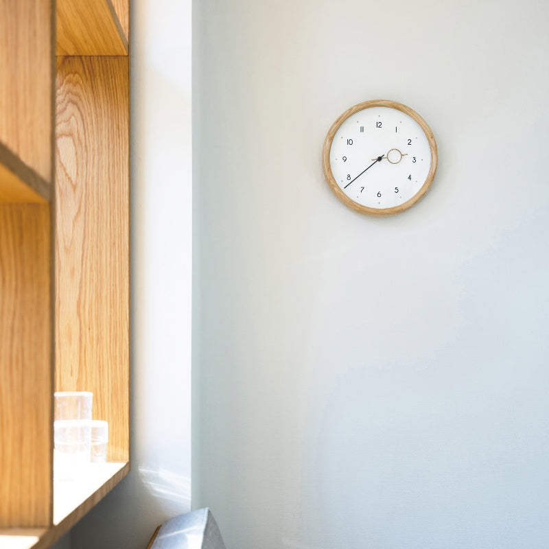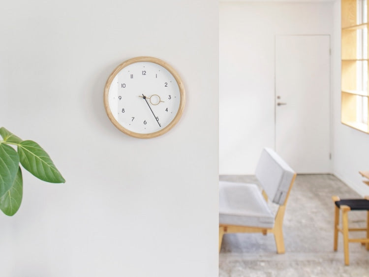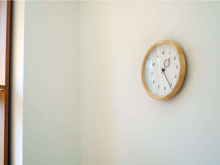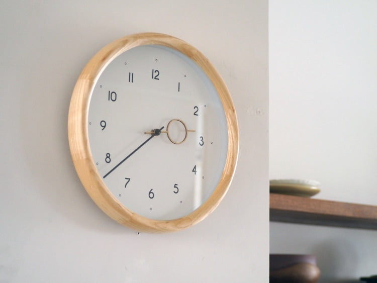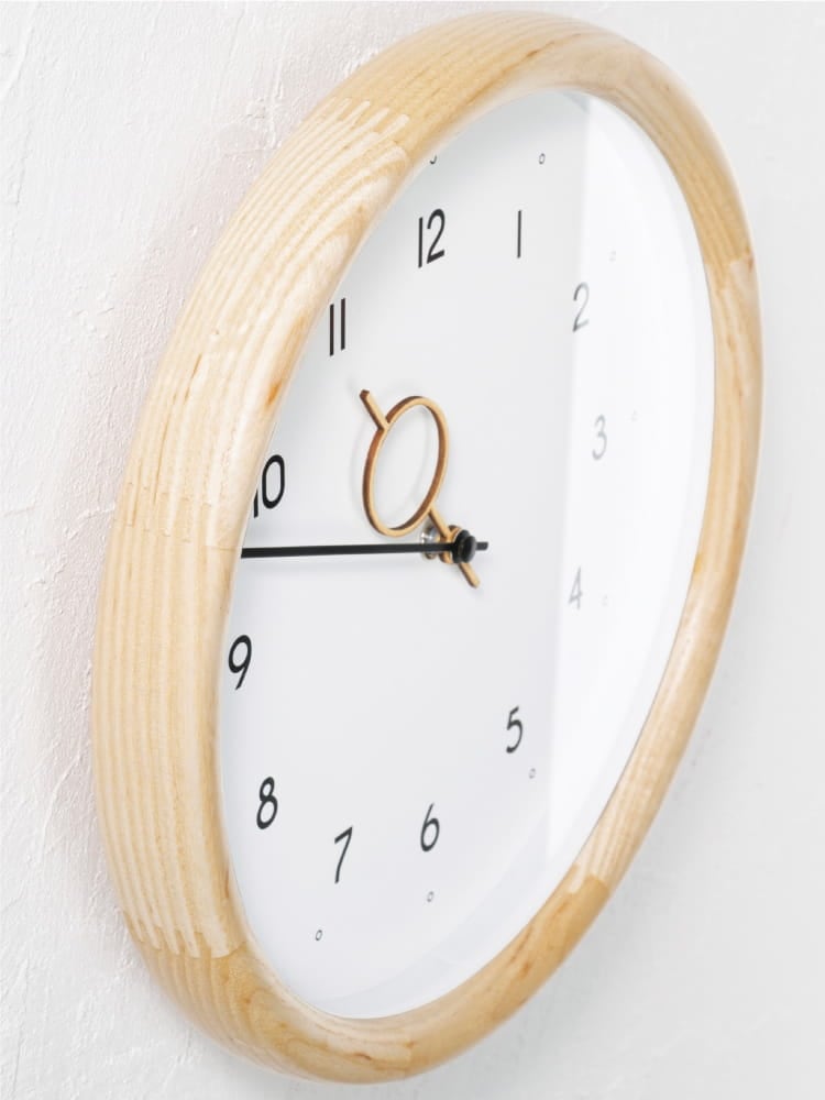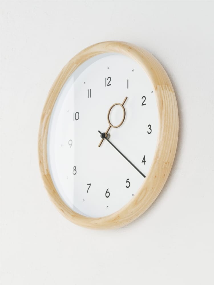 数字や針にも丸みを取り入れた文字盤がフレームと調和し、あたたかみのある素材感でどんな空間にもすっと馴染むニュートラルな存在です。