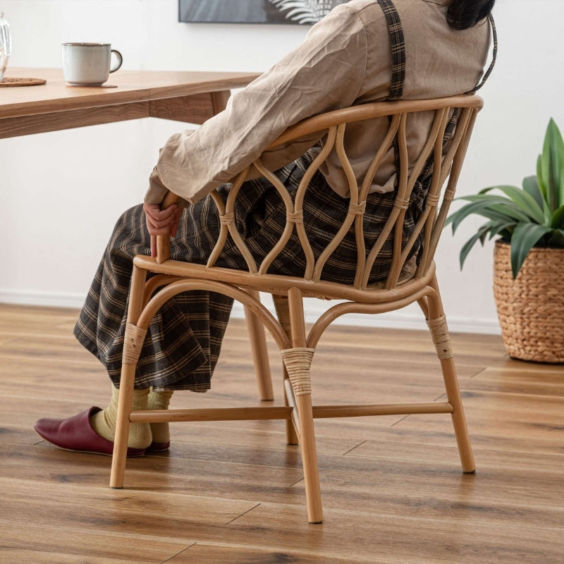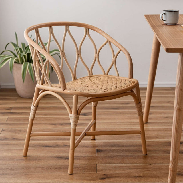 幾重にも重なる曲線が美しい背面のフレームは、光を通すことで部屋の中に柔らかな陰影を生み出します。ラタン特有の温かみとモダンなフォルムが調和し、置くだけでいつものダイニングが洗練されたサロンのような空間に生まれ変わります。