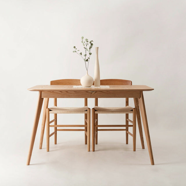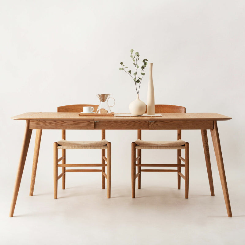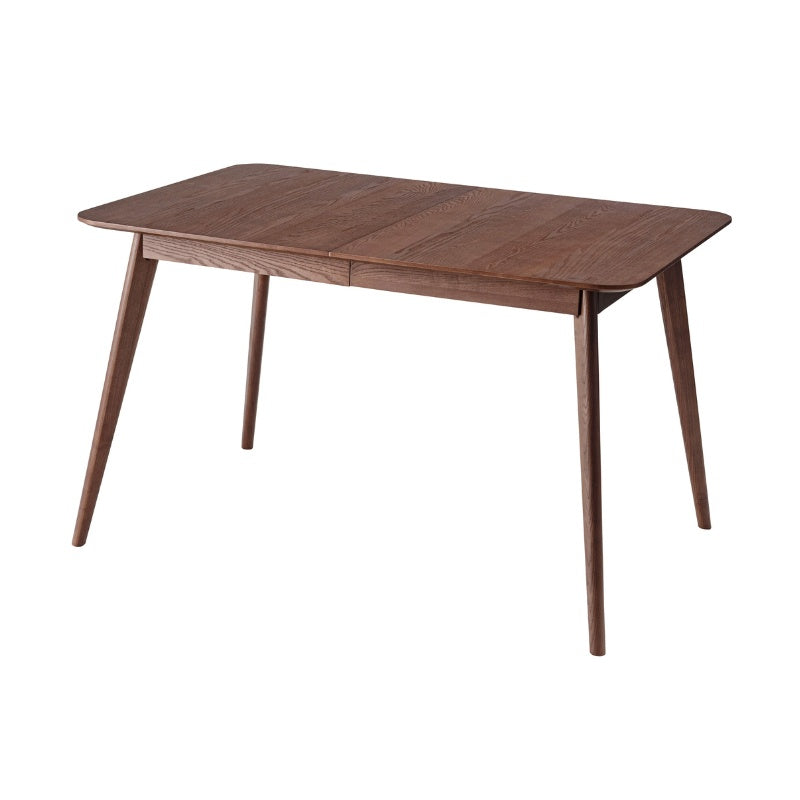 天然木の豊かな表情が、暮らしに温もりを添えるダイニングテーブル。脚部を含めテーブルをスライドさせて広げる伸長式のレールを採用しており、シーンに合わせてフレキシブルにサイズを変えられます。ハの字に広がったスマートな脚部のデザインも目を引くポイント。日々の食事から来客時まで、ライフスタイルに寄り添う使い心地が魅力です。