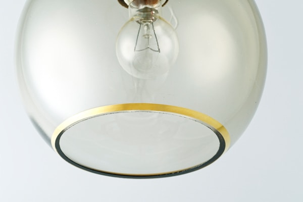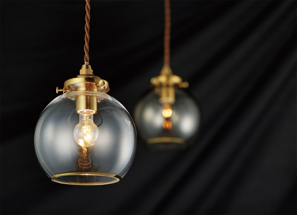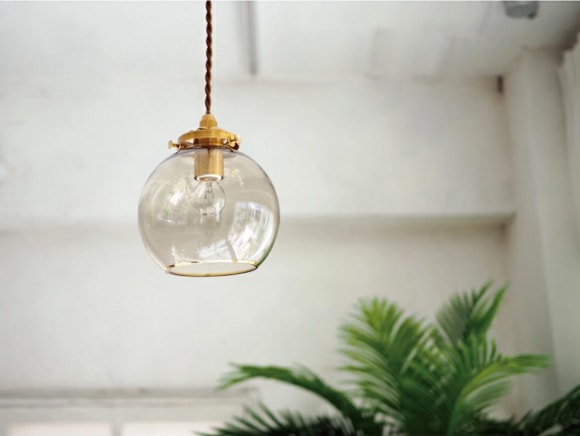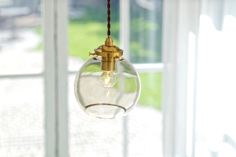 丸いガラスシェードの縁にあしらったゴールドのラインがフェミニンな装いのペンダントライト。