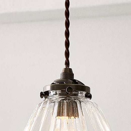 アンティークゴールドのソケットとブラウンのよりコードを合わせることで、落ち着いた味わいになりました。 吊るす長さの調節が可能で、余ったコードはシーリングカップの中にすっきりと収納できます。