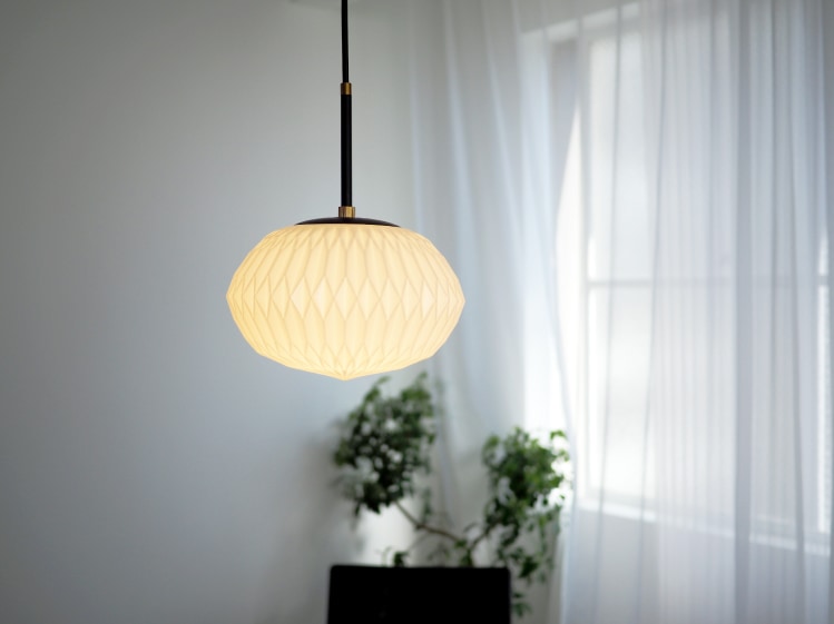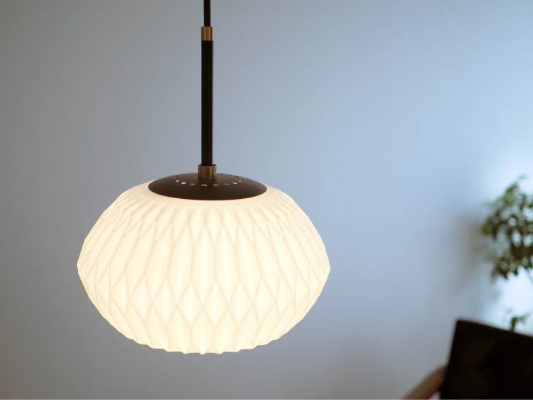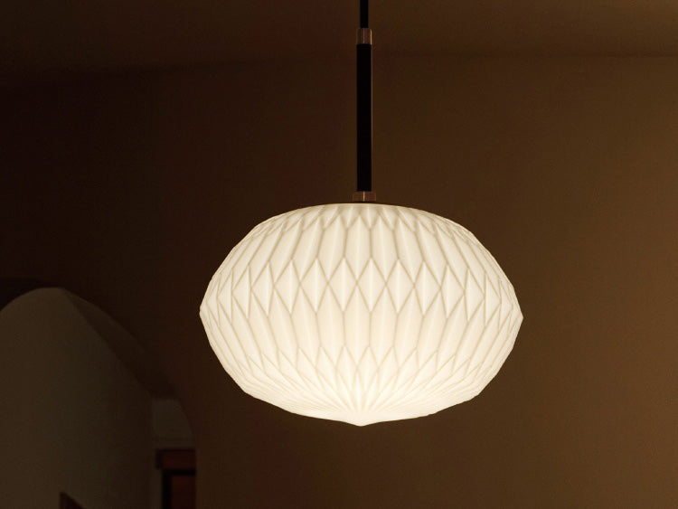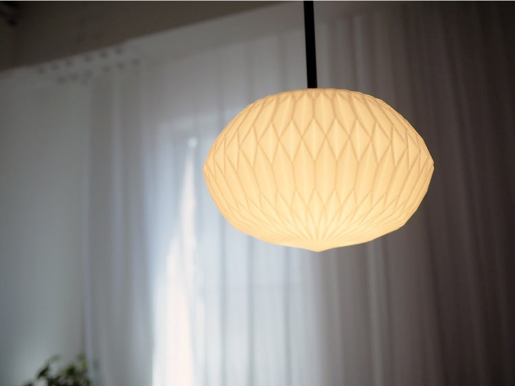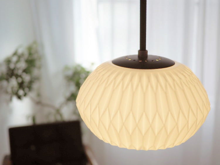 折り紙のような凹凸のあるホワイトガラスが柔らかな陰影を描く、モダンなペンダントライト。
