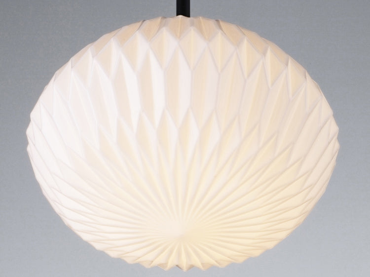 幾何学模様のように凹凸を繰り返すガラスシェードを楕円フォルムに落とし込みました。 角ばった印象が和らぎ、繊細さが際立ちます。