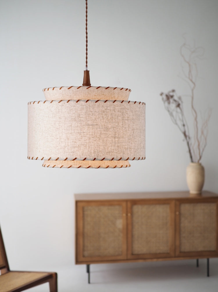 ファブリックシェードの縁にブラウンの合皮でステッチを施しました。 アメリカのビンテージ品を思わせる特徴的なアクセントになっています。