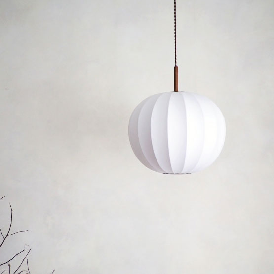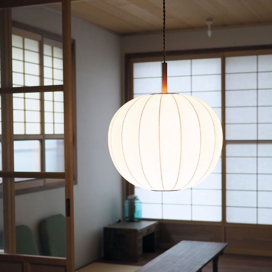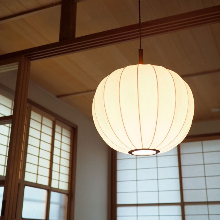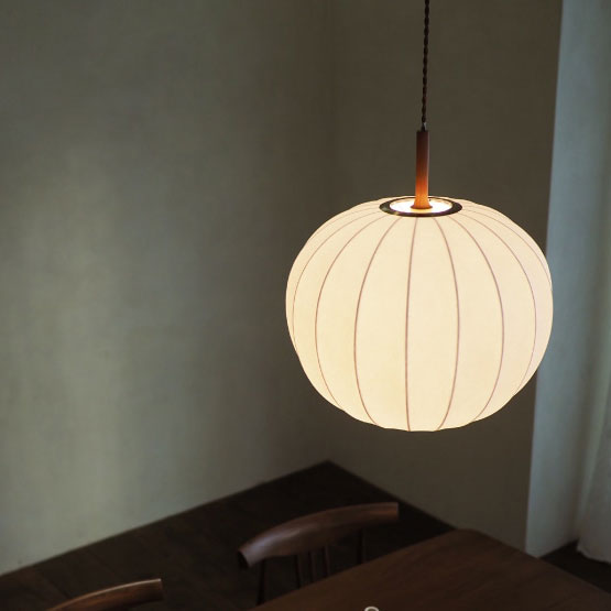 シルクのようにしなやかな素材を用いた、素朴で柔らかな光を灯すペンダントライト。心地よいカーブを描きながら膨らむフォルムは懐かしさも感じさせます。