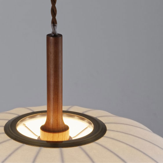 点灯させると骨組みの影が浮かび上がるシェードは、和紙にも似た素材感で古くから伝わる提灯を思わせるほのかな灯りを広げます。