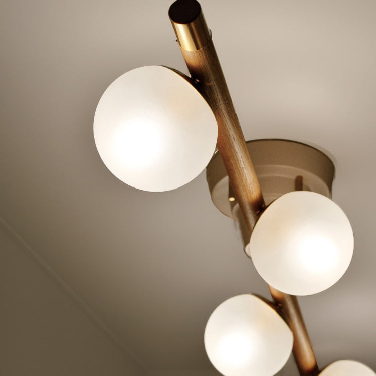 - インスピレーションはぽつぽつと実りを付けた枝から。ナチュラルな装いの木製アームと、床に対して斜めに、そして交互に配置したガラスシェードがやさしいリズム感を生みます。しっかりとした円柱フォルムと細部のゴールドパーツが高級感を感じさせるアクセントに。手のひらサイズの小さなフロストガラスがまぶしさをやわらげ、心地よい空間を演出します。