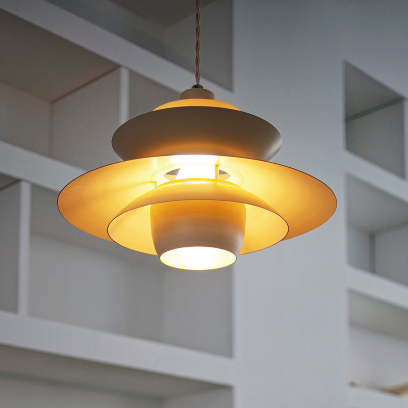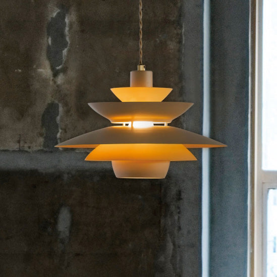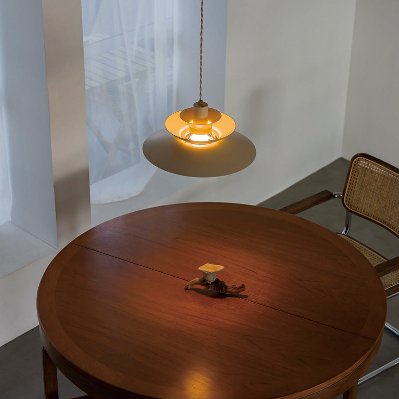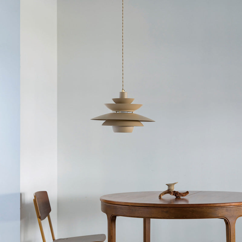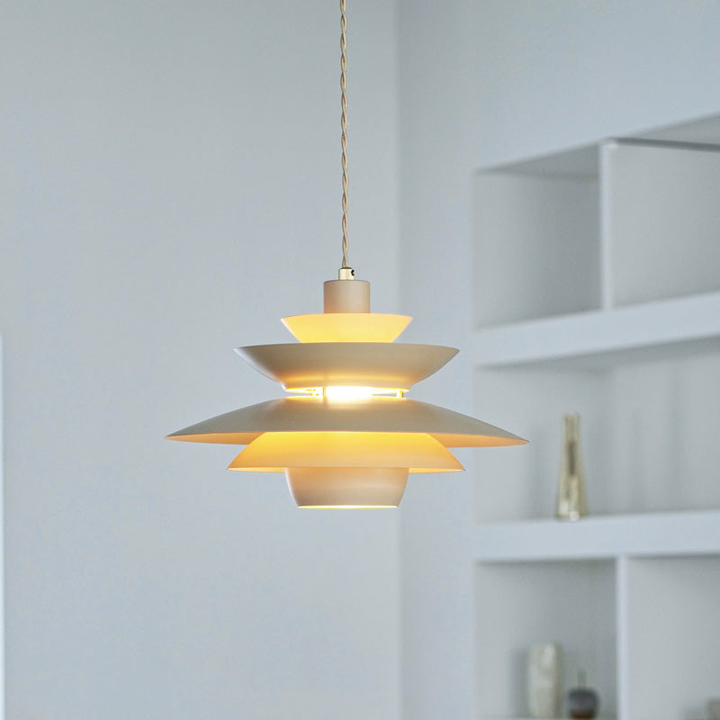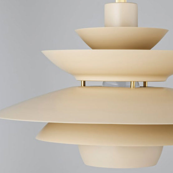 - 合計5枚のアルミシェードが作りだす光の階層が楽しめるグレアフリーデザイン。 浅めのアールとシャープな素材感がミニマルな印象を与えつつ、コードも含めサンドベージュでまとめたカラーリングがぬくもりを感じさせます。 横から見ると隙間からわずかに電球が見える様は、水平線から昇る朝日のよう。 ダイニングテーブルの上でも収まりのいいコンパクトなサイズに仕上げています。