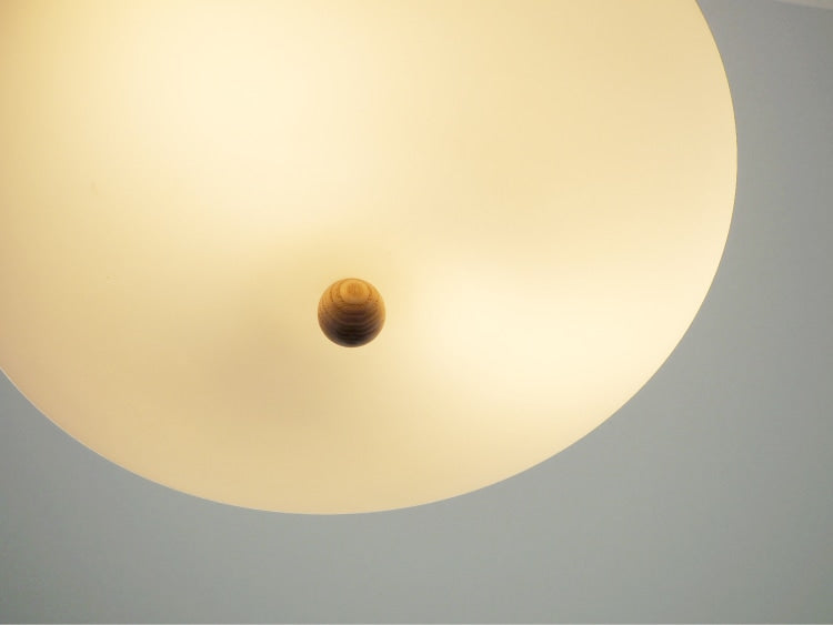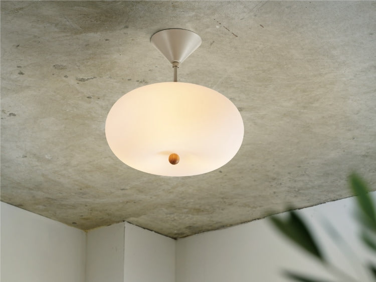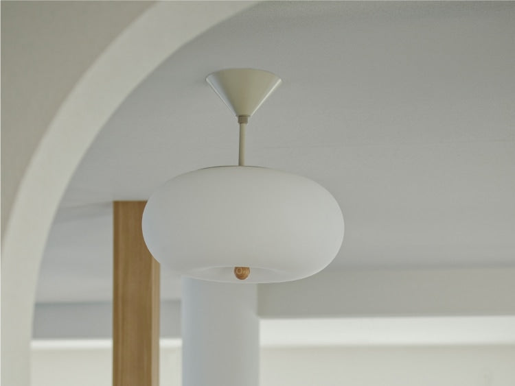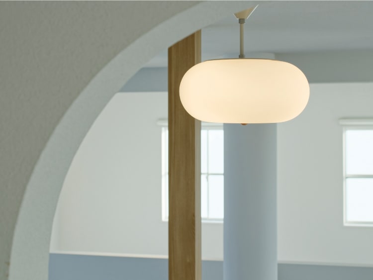ふんわりと光を広げるホワイトフロストのガラスが柔らかさを感じさせ、雲のような陰影を作り出します。 丸みのあるオーバル型のガラスシェードを少しくぼませることで、うっすらと影が落ち、立体感が生まれました。