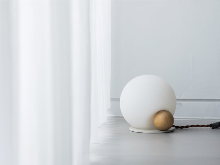 2つのボールが寄り添う、アートオブジェのような丸いフォルムのテーブルライト。