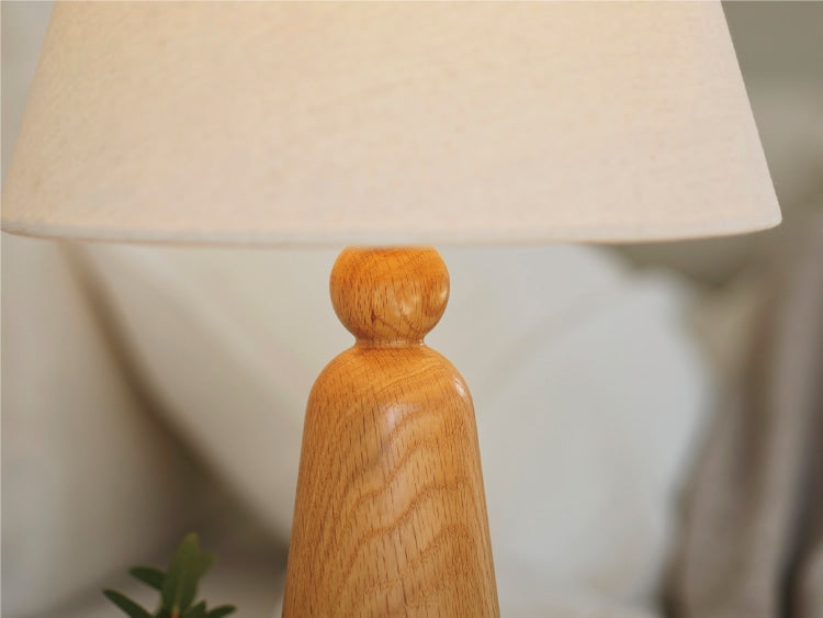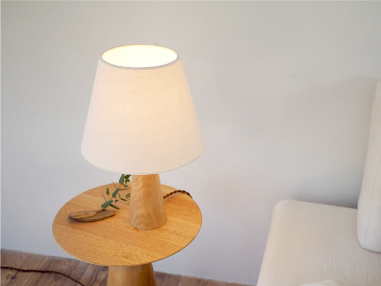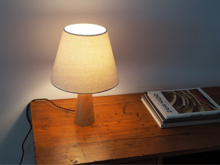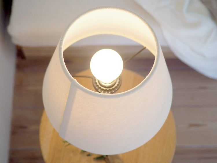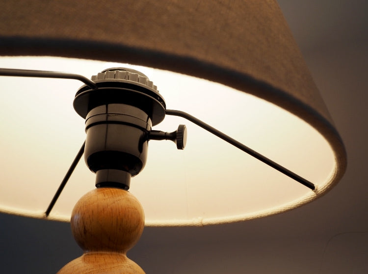 削り出しの技術で仕上げられた一体形成の支柱に、大きめのファブリックセード合わせています。