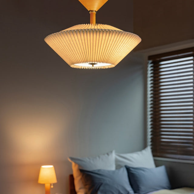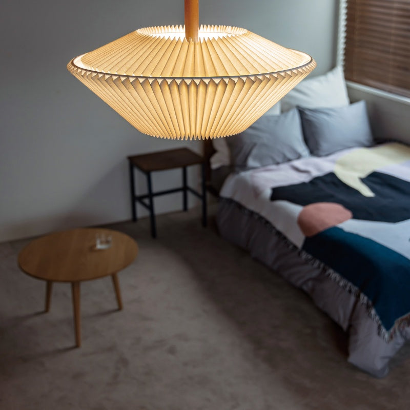 規則正しい陰影を生み出すプリーツセードを上下に重ねた、和傘にインスパイアされた工芸品のようなデザイン。