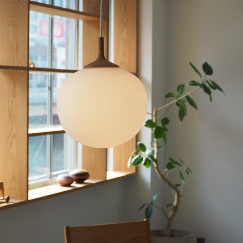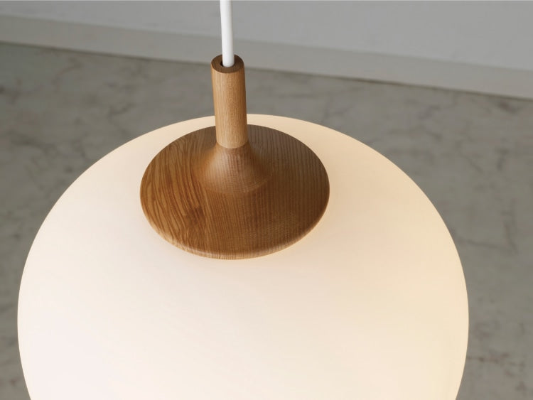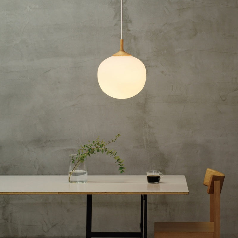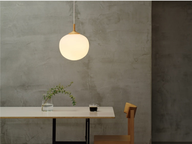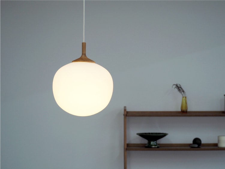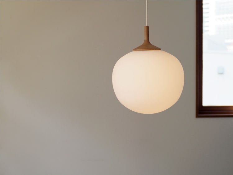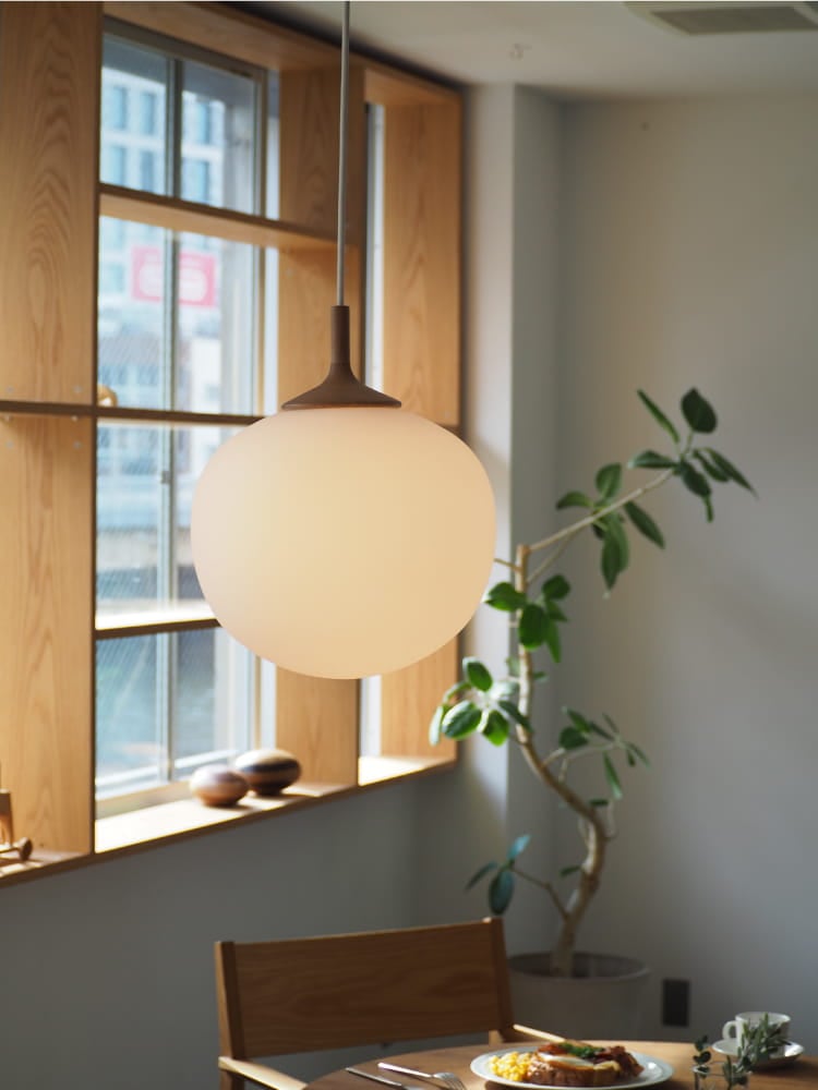 どんぐりをモチーフにした有機的なフォルムを温かみのあるデザインに落とし込みました。 豊かなふくらみとフロストホワイトの柔和な表情が、包み込まれるような素朴なあかりを広げてくれます。