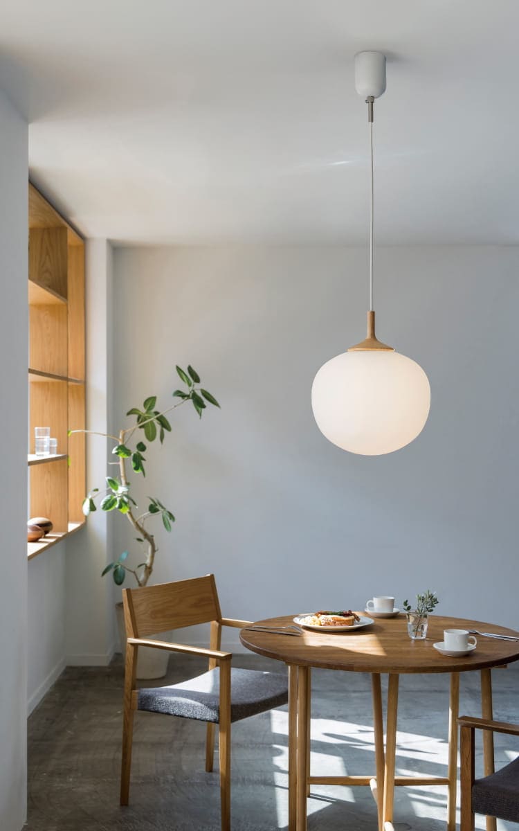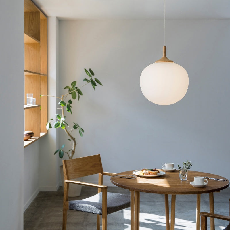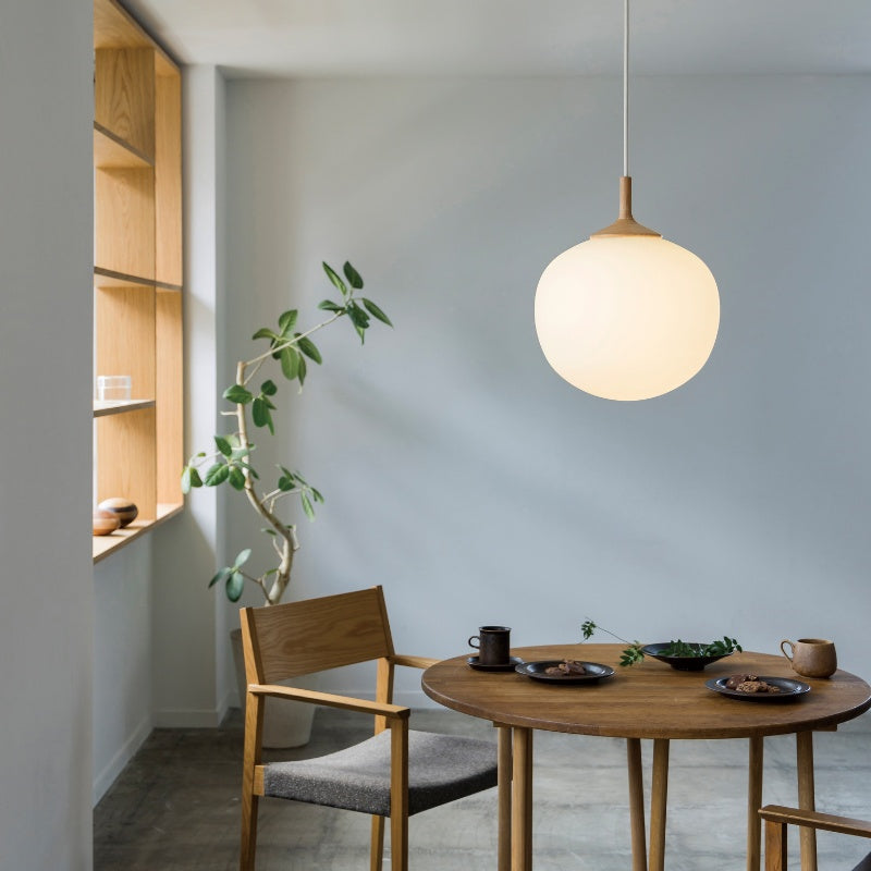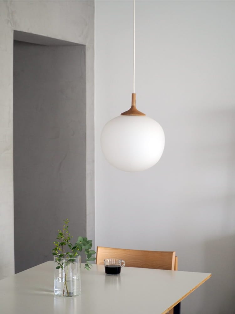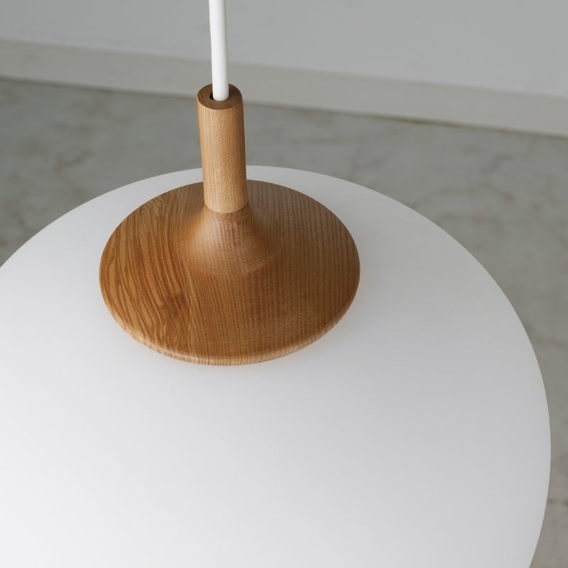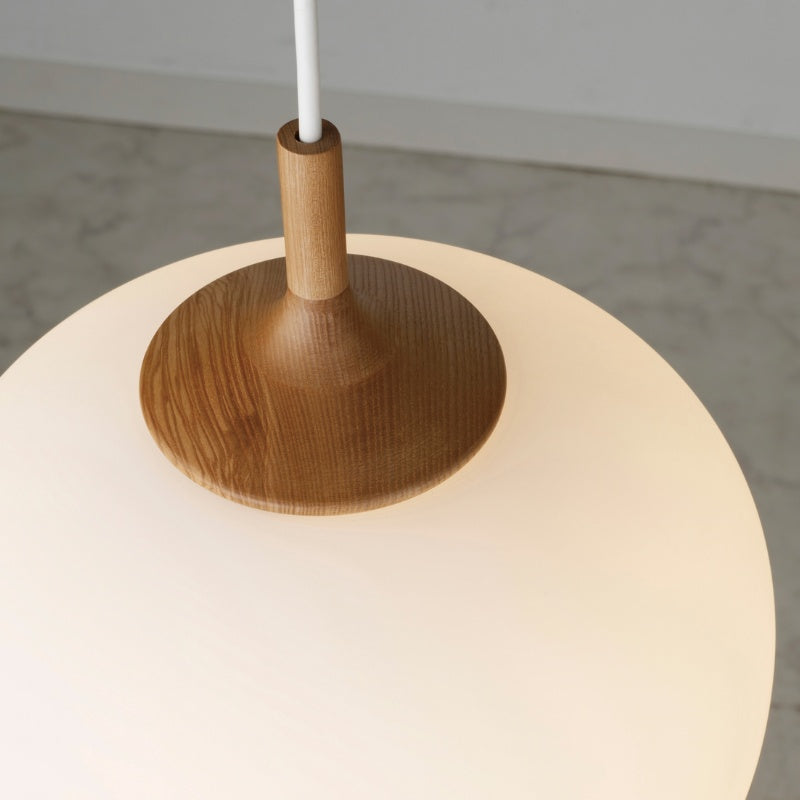 どんぐりをモチーフにした有機的なフォルムを温かみのあるデザインに落とし込みました。 豊かなふくらみとフロストホワイトの柔和な表情が、包み込まれるような素朴なあかりを広げてくれます。