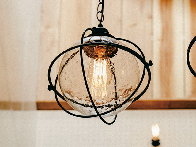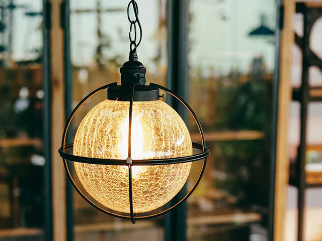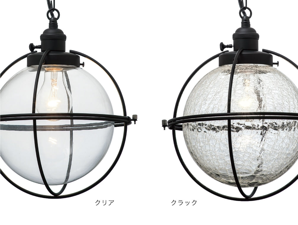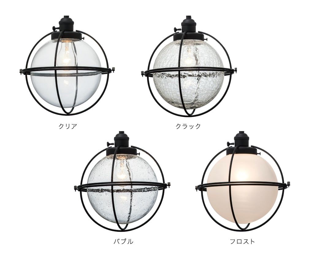 丸いガラスシェードのまわりを囲むブラックのガード。 目に留まるインダストリアルなデザインは、空間コーディネートのアクセントとなります。