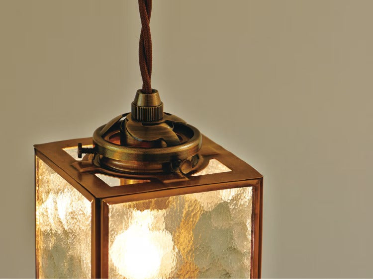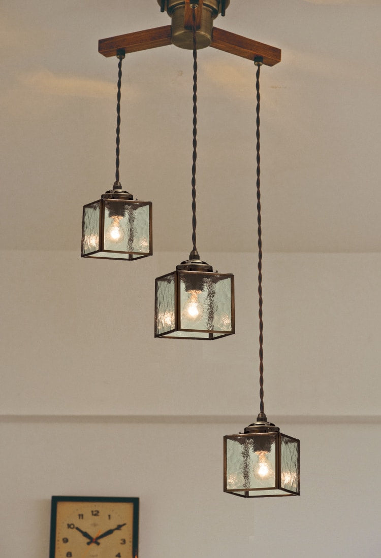 バランスを取るのが難しい複数吊りをひとつで手軽にお楽しみいただける3灯タイプです。 キュービックフォルムのレトロなガラスシェードからあたたかな光が降り注ぎます。